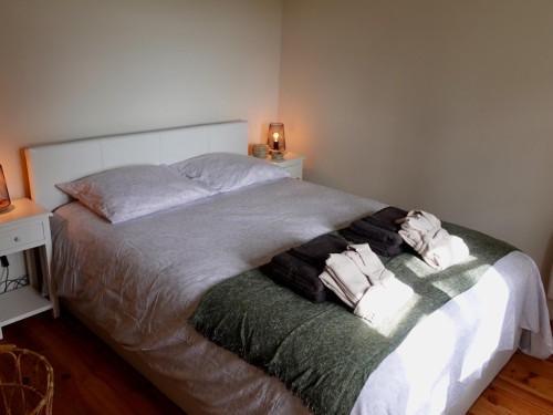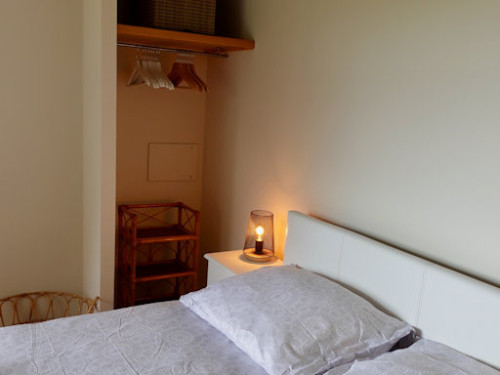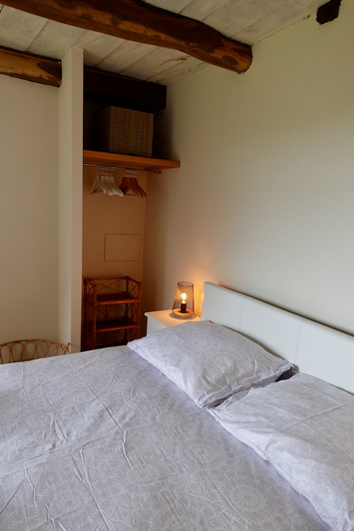 Il comporte une chambre avec un lit double, une armoire avec une étagère.