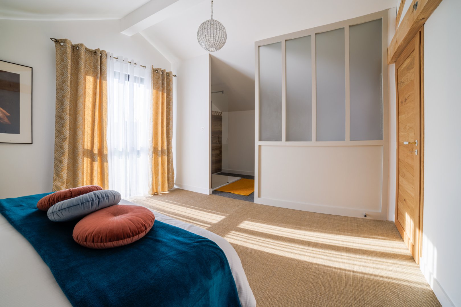 Gîte avec 3 chambres, 3 salles de bains dont une adaptée pour les personnes à mobilité réduite, cuisine entièrement équipée attenante à la salle à manger et séjour.