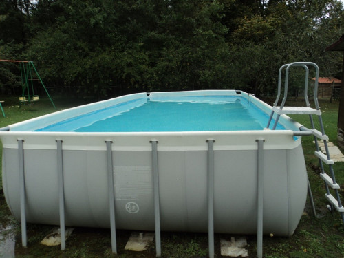 Grand terrain, terrasse, barbecue, salon de jardin.