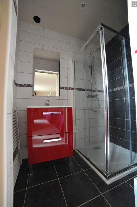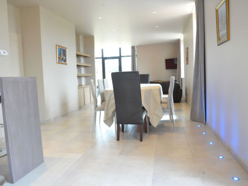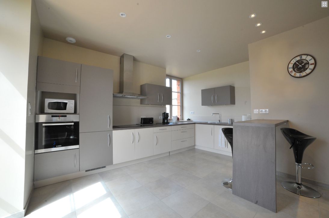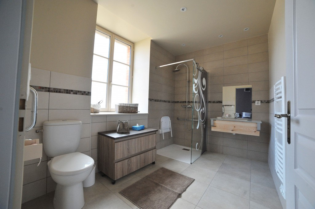 Le rez-de-chaussée, agréé handicap moteur, se compose d'une grande pièce à vivre équipée d'une cuisine moderne et d'une belle chambre avec salle de bains privative et spacieuse.