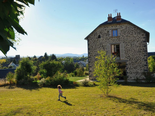 Côté sud une grande terrasse offre une vue agréable sur l'église romane du village et sur le Plomb du Cantal situé à 15 km.