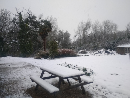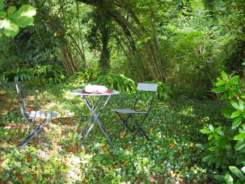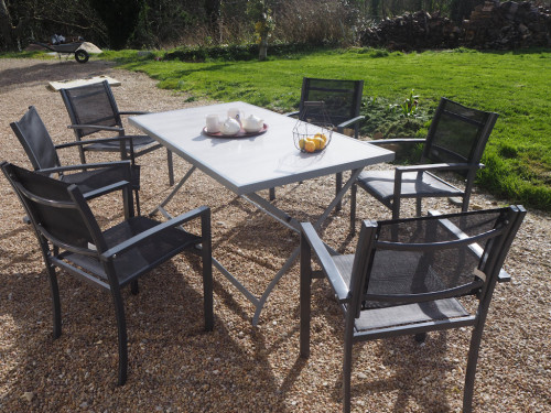 Un coin pelouse avec une table forestière pour un apéro, une pause café, un repas façon pique nique ou plus, mais aussi un salon de jardin à installer sur la terrasse orientée plein sud ou en Février il est parfois possible de prendre un repas au soleil, tout cela dans un cadre reposant.