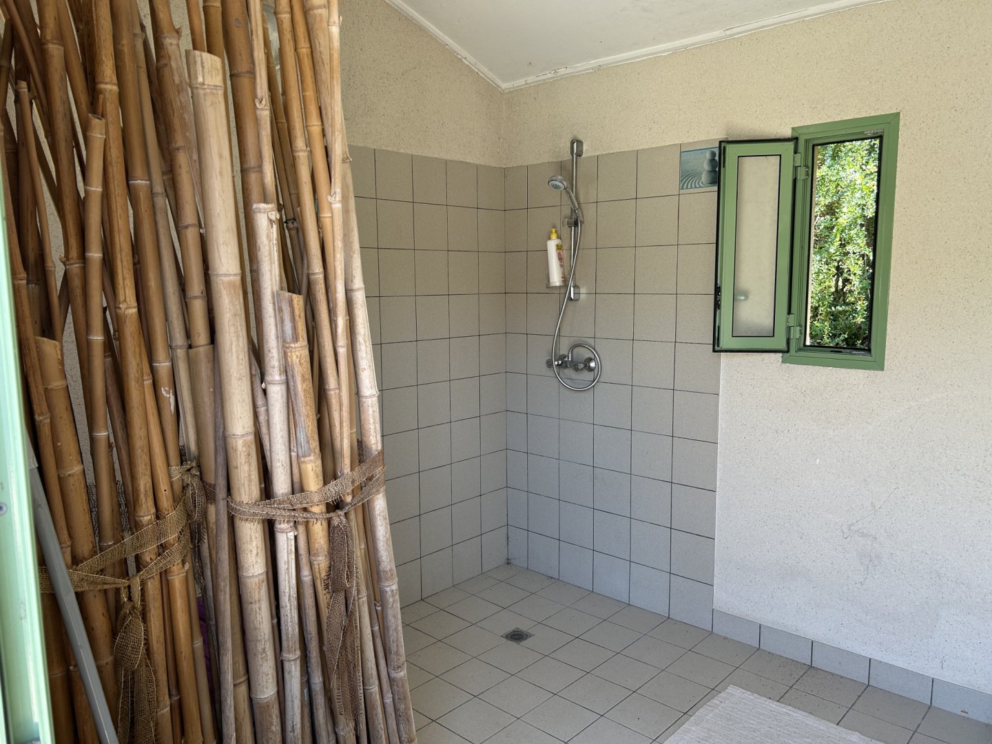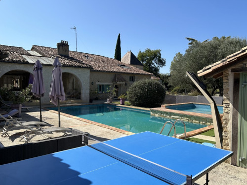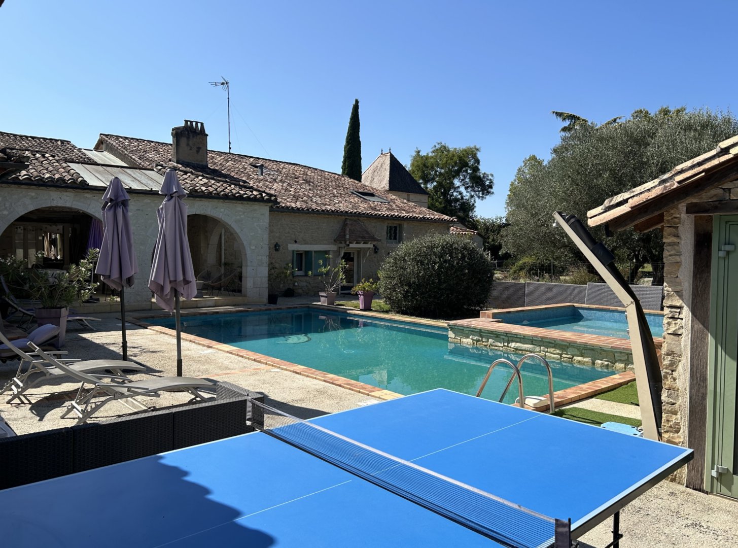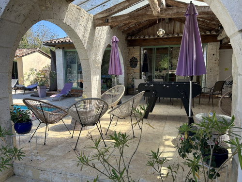 Salon de jardin, barbecue, table hockey, jeux divers dans la cuisine d’été, chaises longues, billard.