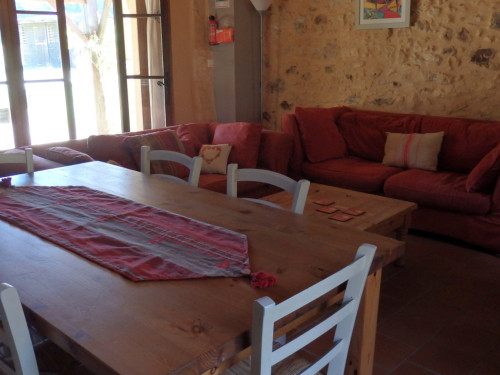Grande pièce ouverte cuisine, salle à manger, salon, confortablement meublé,avec une double porte ouvrant sur une terrasse meublée privative, avec un barbecue.