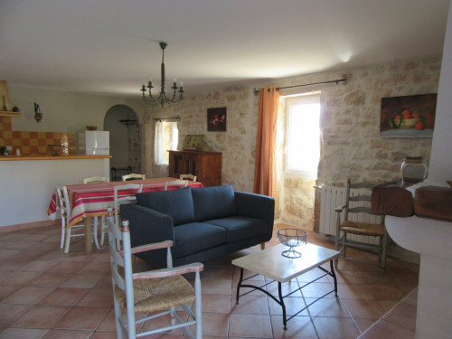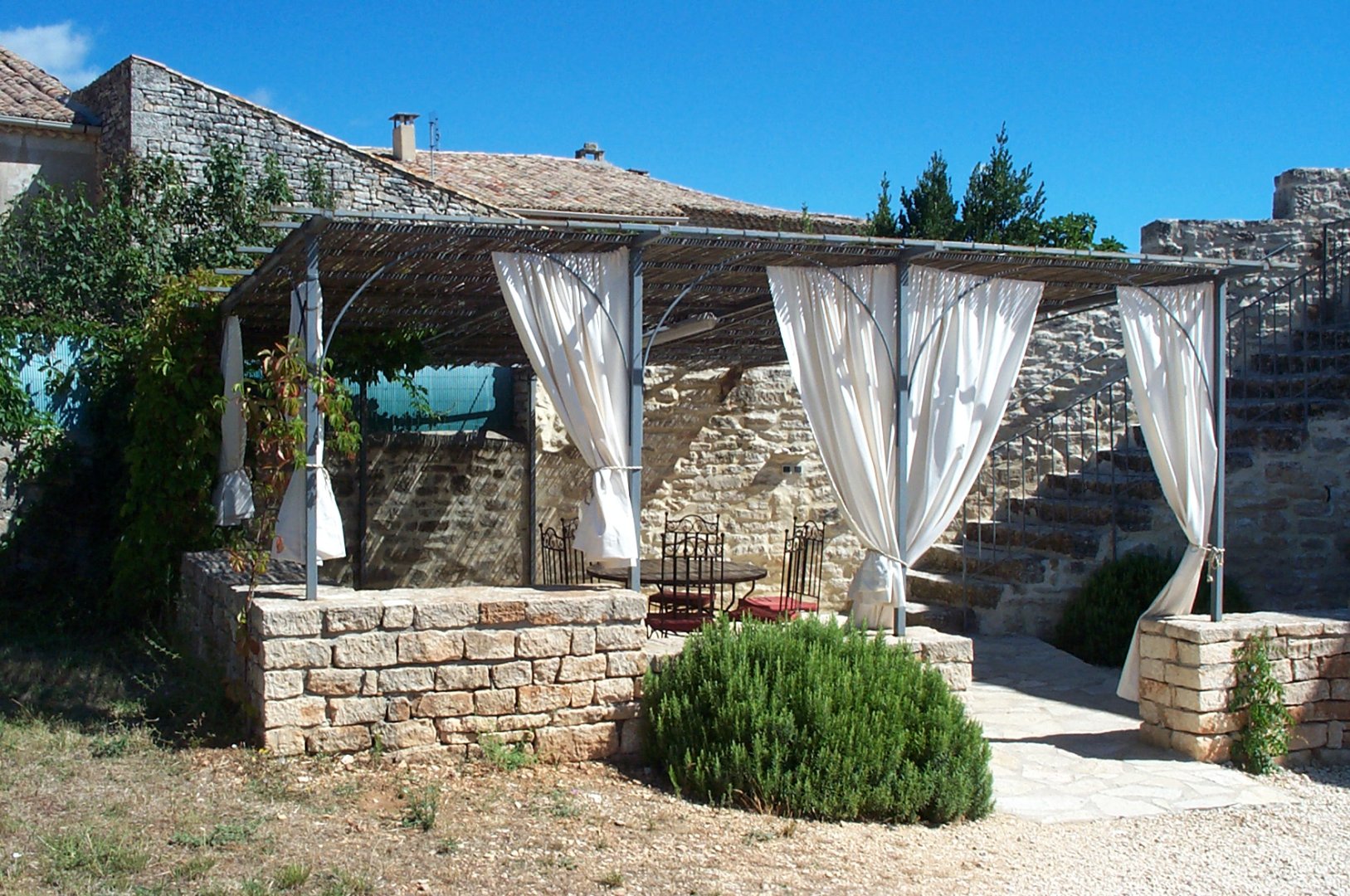 Grande terrasse ombragée par une tonnelle sous laquelle vous pourrez apprécier le calme troublé par le seul chant des cigales ou des grillons
