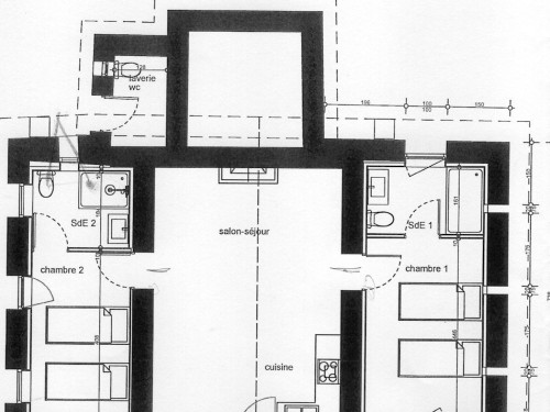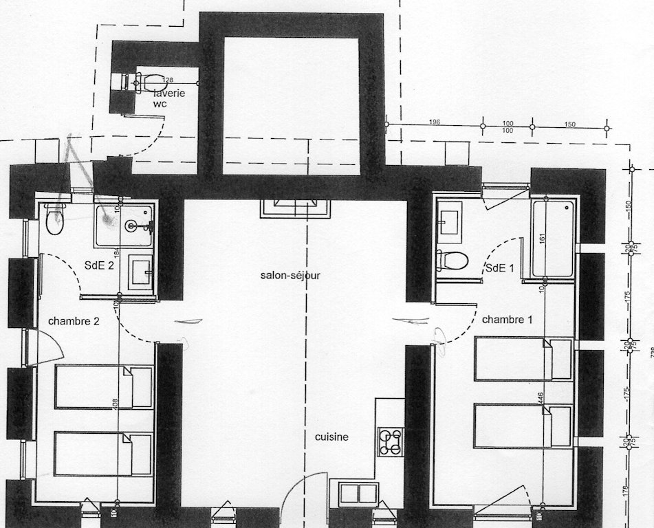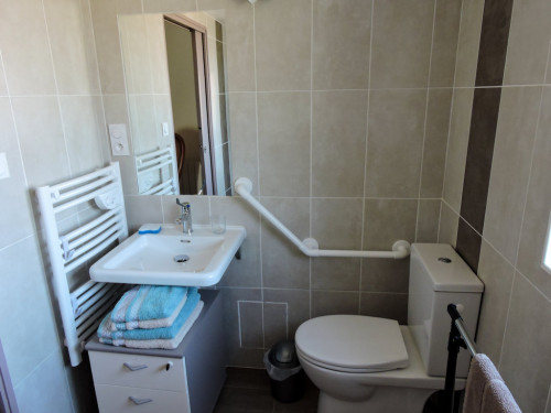 Rez-de-chaussée : séjour-salon-cuisine (radio/CD), 1 chambre avec salle d'eau/wc (1 lit 160), 1 chambre avec salle d'eau/wc (2 lits 90). Local rangement.