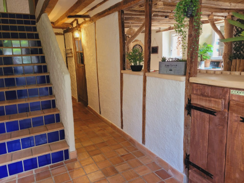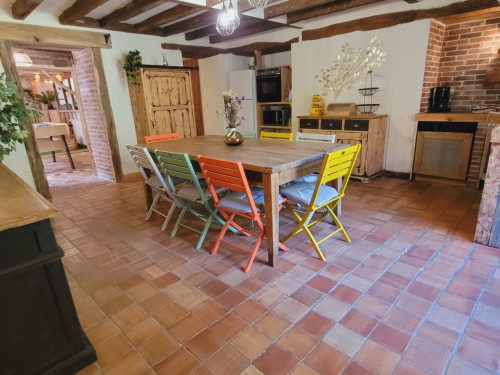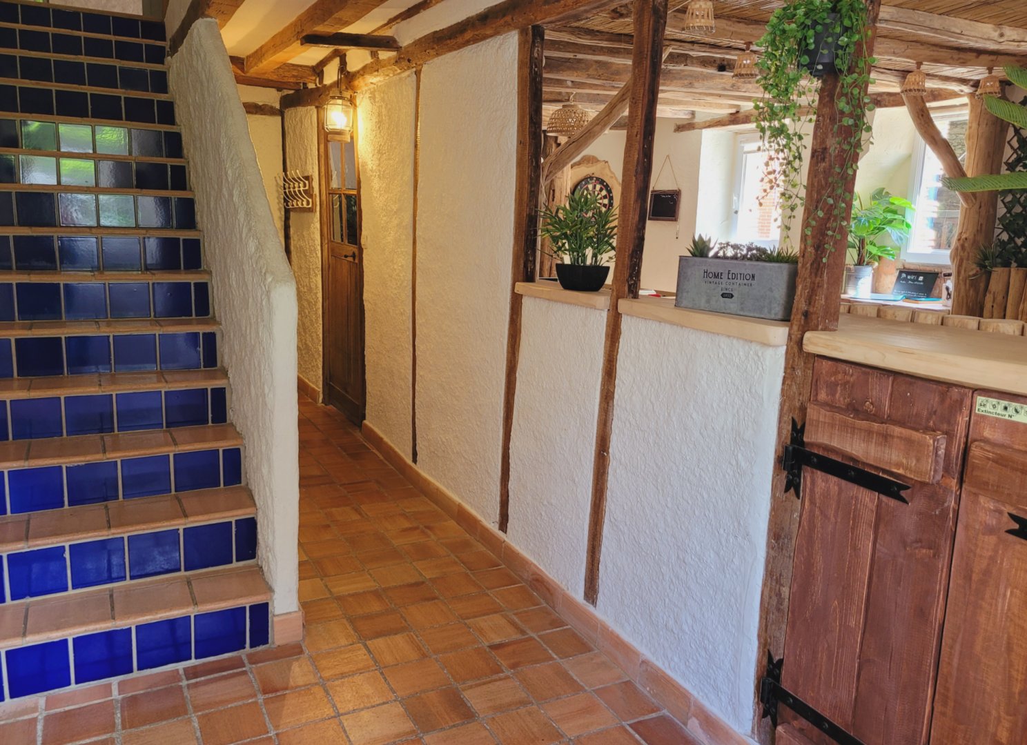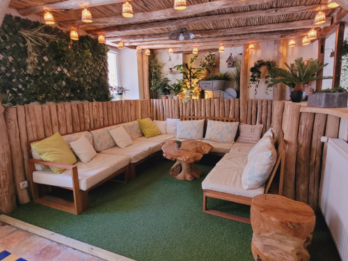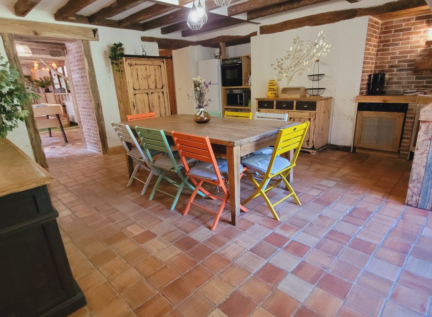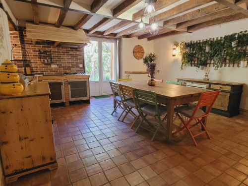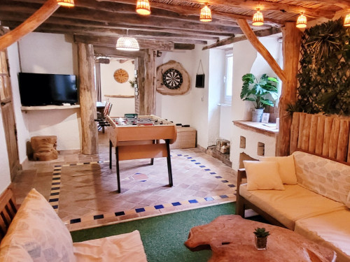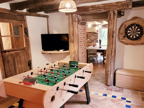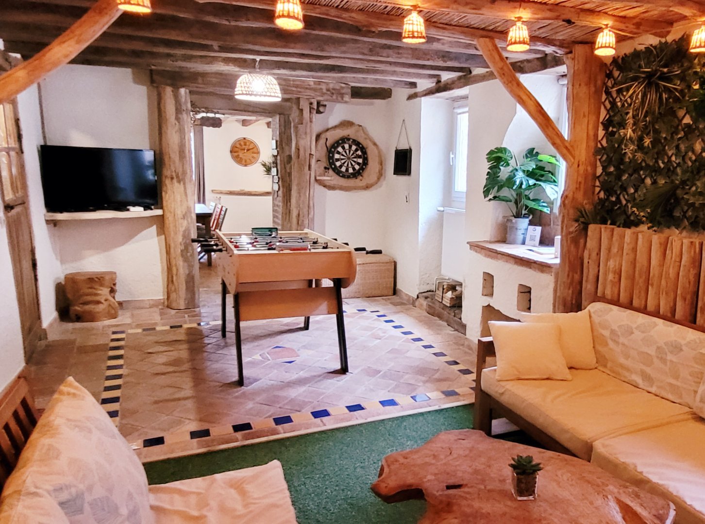 • en rez-de-chaussée : un salon avec TV et espace de jeux - babyfoot et fléchettes, WC. Une grande cuisine conviviale, qui se poursuit sur le jardin où vous pourrez également prendre vos repas sous la pergola à l'esprit "guinguette".