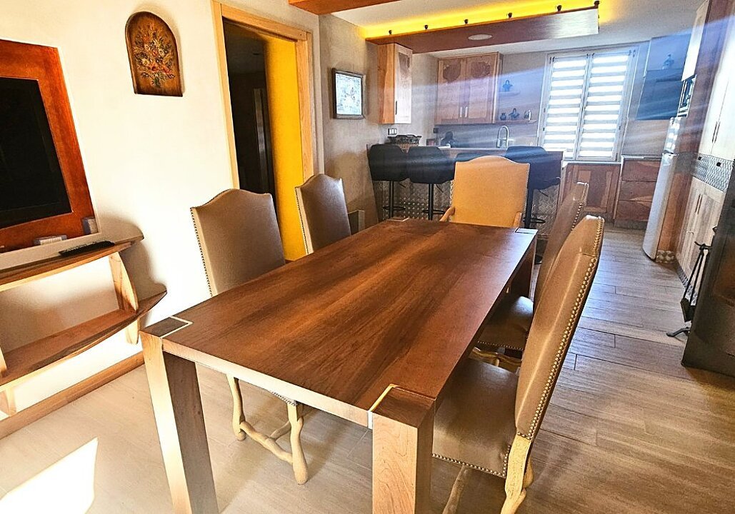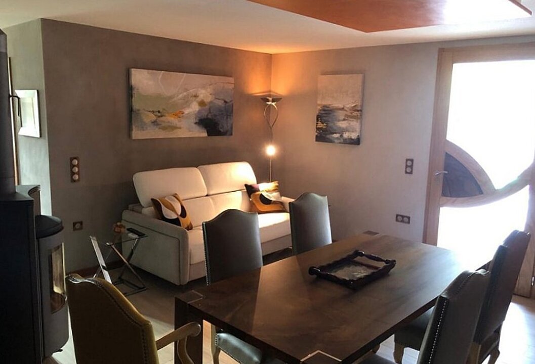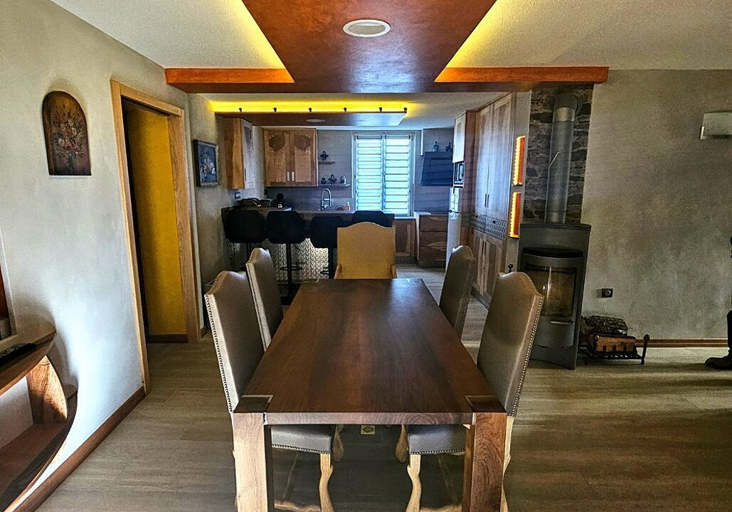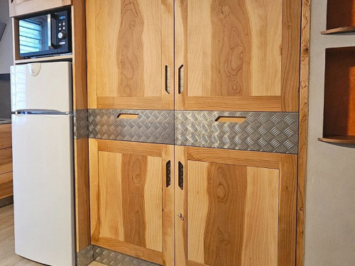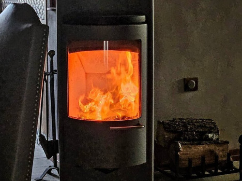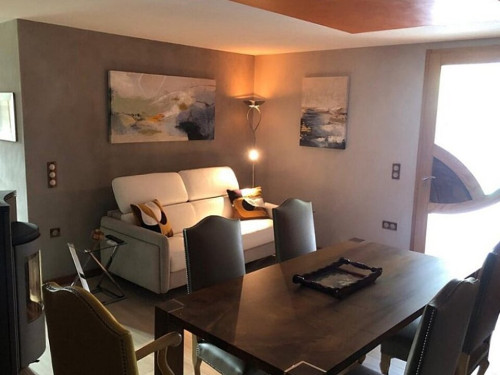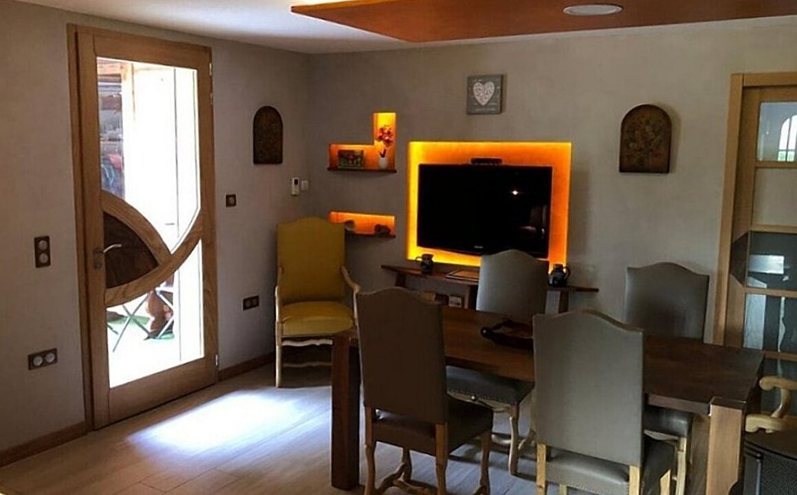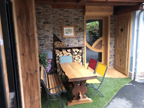 La pièce à vivre comporte un poêle à bois qui complète le chauffage au sol, une cuisine équipée avec mange-debout, table centrale pour déjeuner en toute convivialité, canapé convertible et téléviseur. Cette pièce vous mènera à la cour extérieure, de plain-pied sans vis-à-vis, comportant un espace détente.