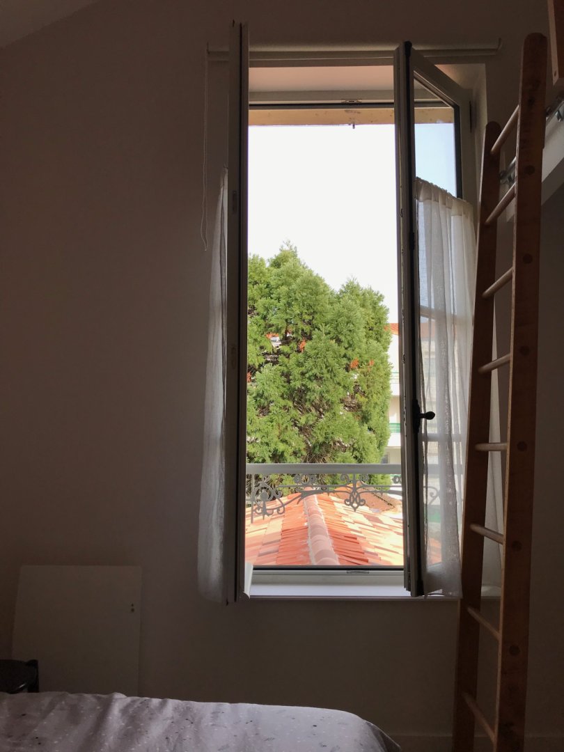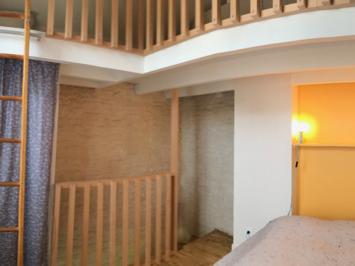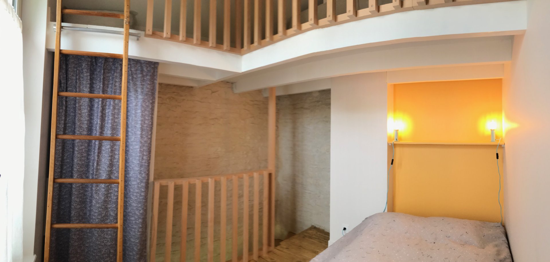 Chambre sur mezzanine : lit 140x190 neuf, couette, oreillers neufs. Penderie. Mezzanine : 1 matelas pour 1 enfant (90x200).
