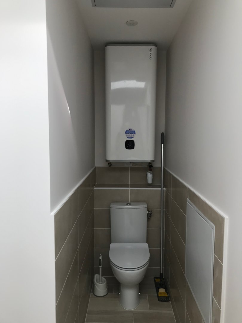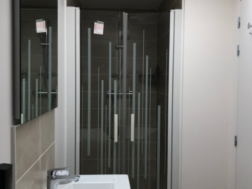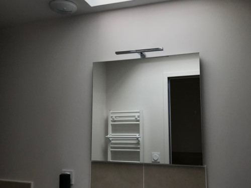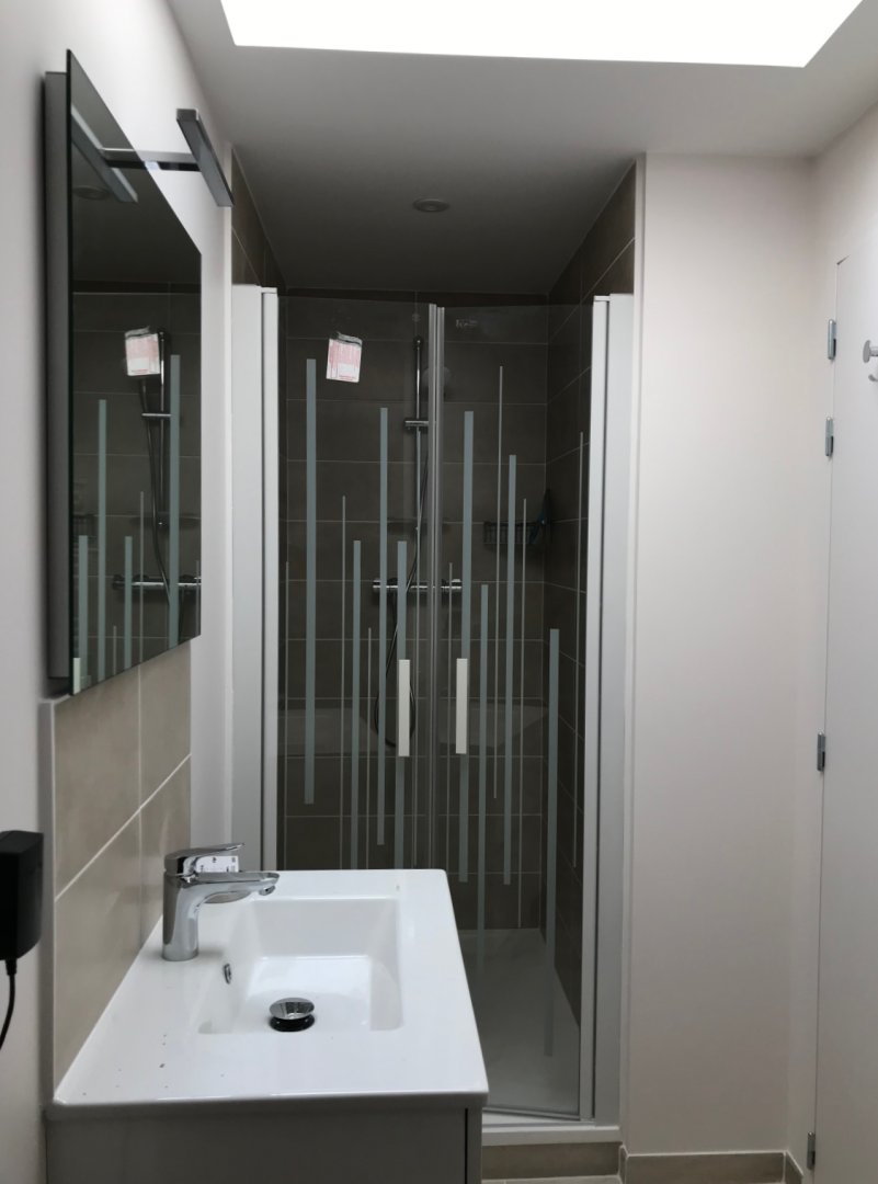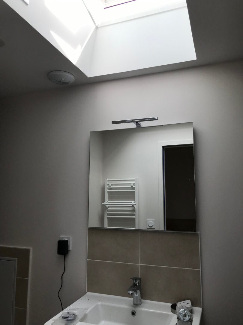 Salle de bain : WC, vasque sur meuble, douche, sèche-serviettes. Fenêtre de toit.