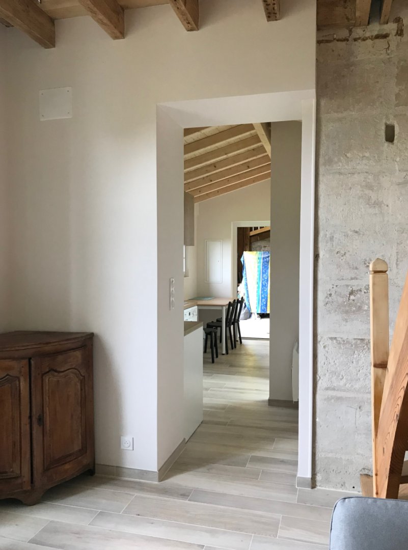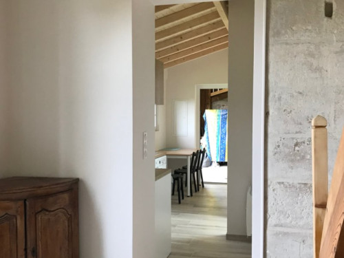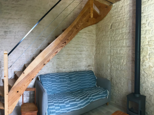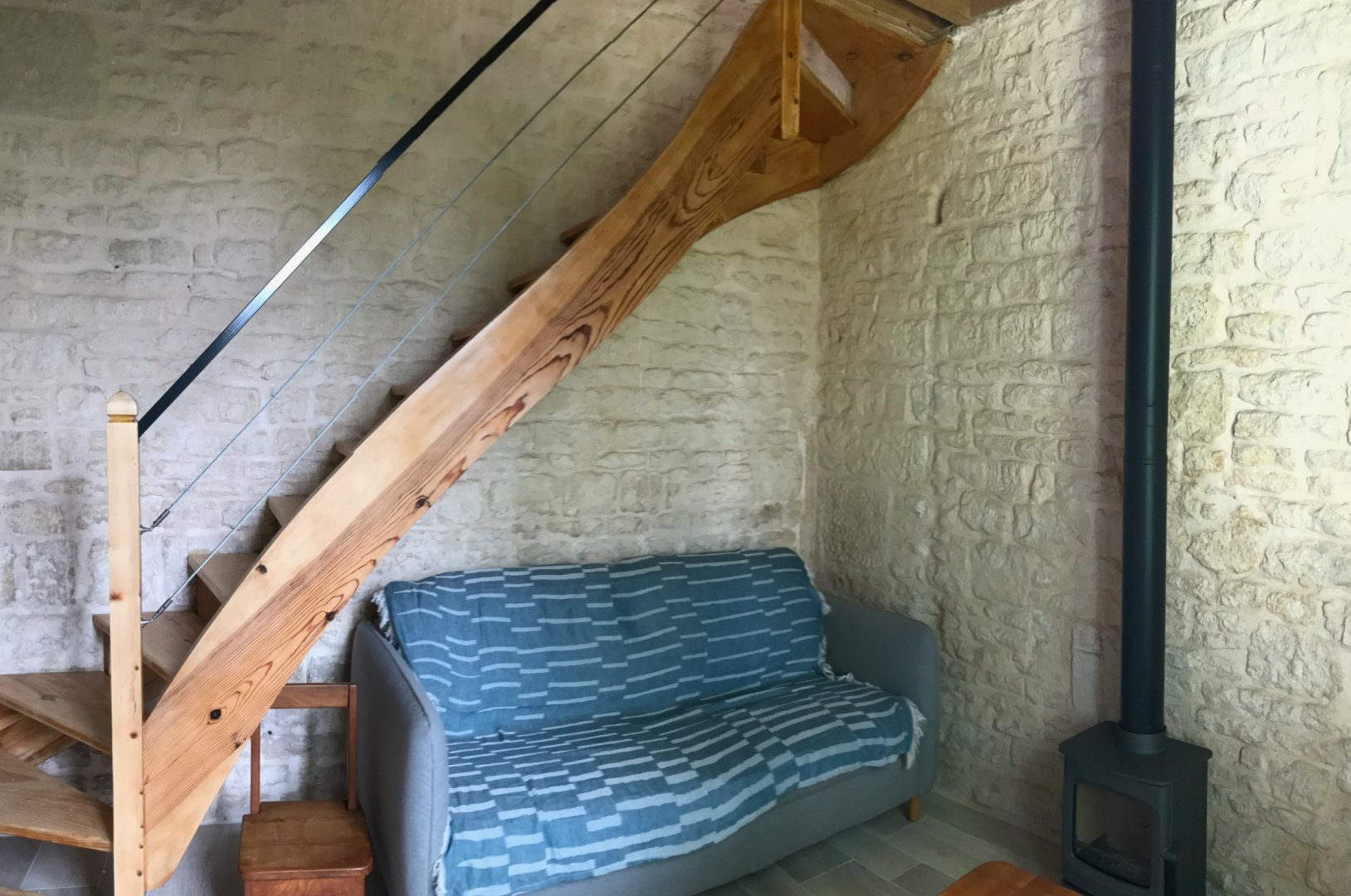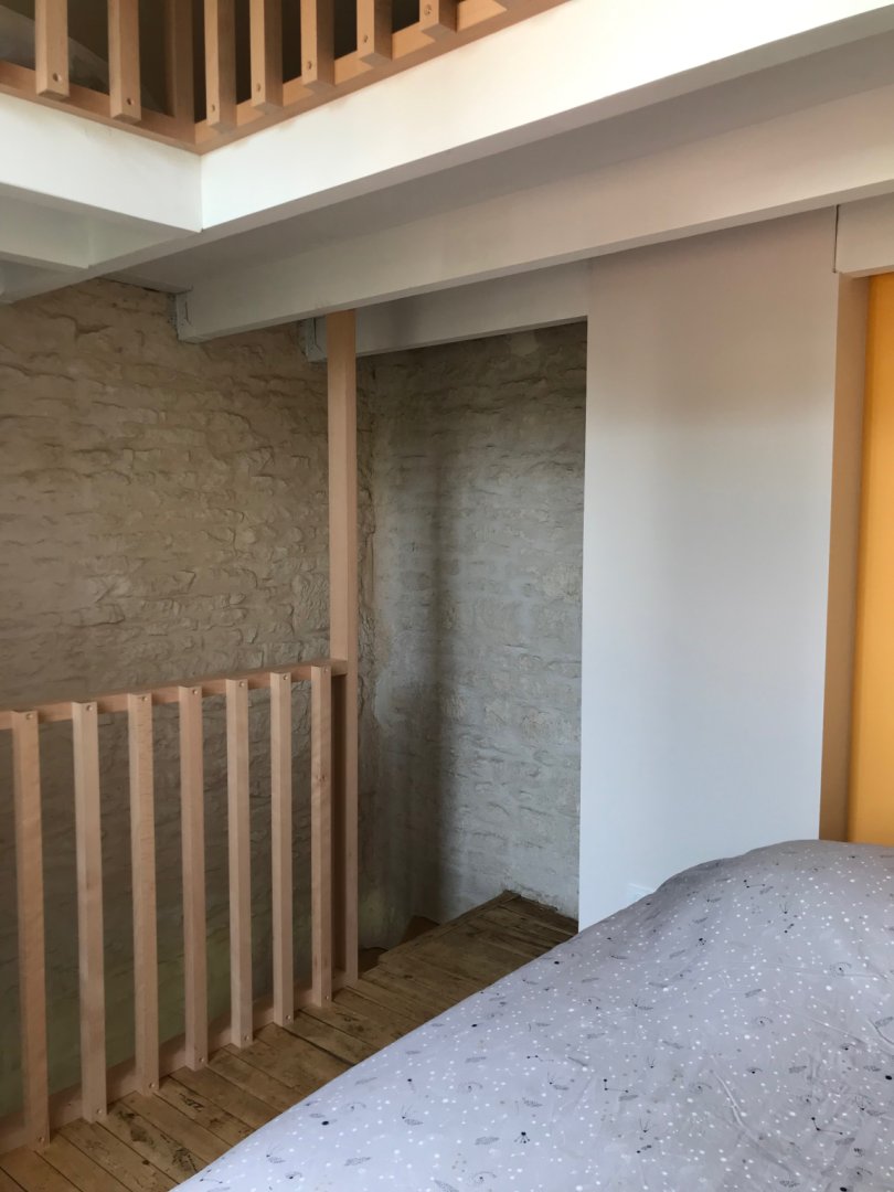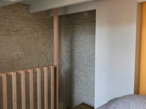 Salon et chambre sur mezzanine dans construction ancienne de pierre calcaire.