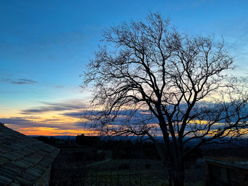 La petite route serpentant entre les vignes qui mène à notre maison s'y arrête, pour se transformer en chemin de Grande Randonnée à travers la montagne et la forêt.