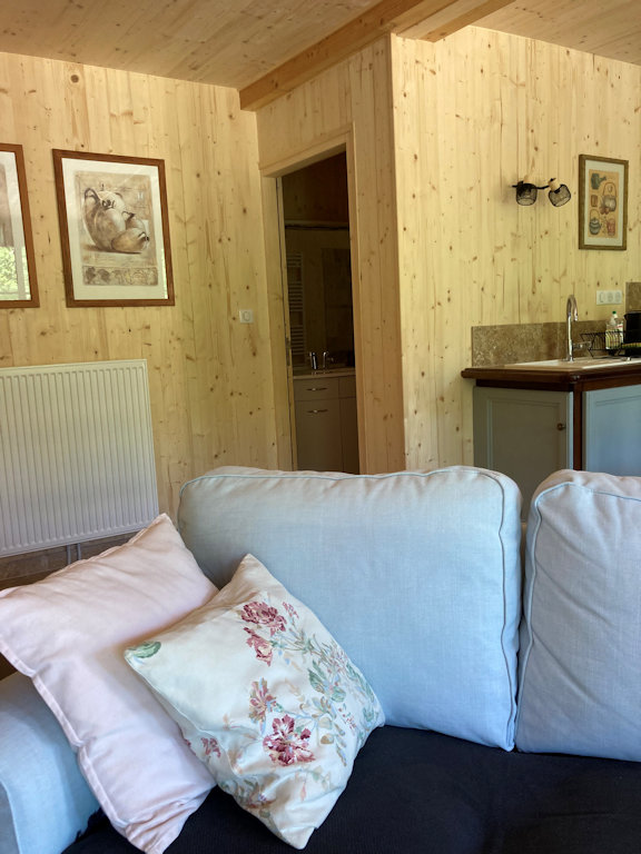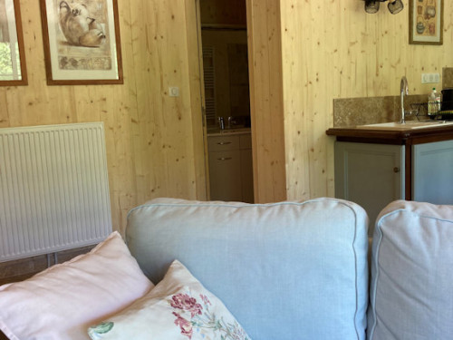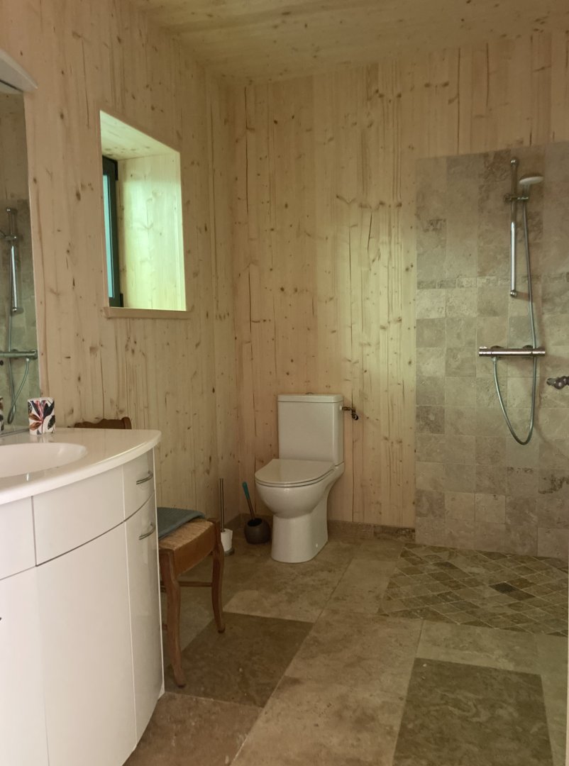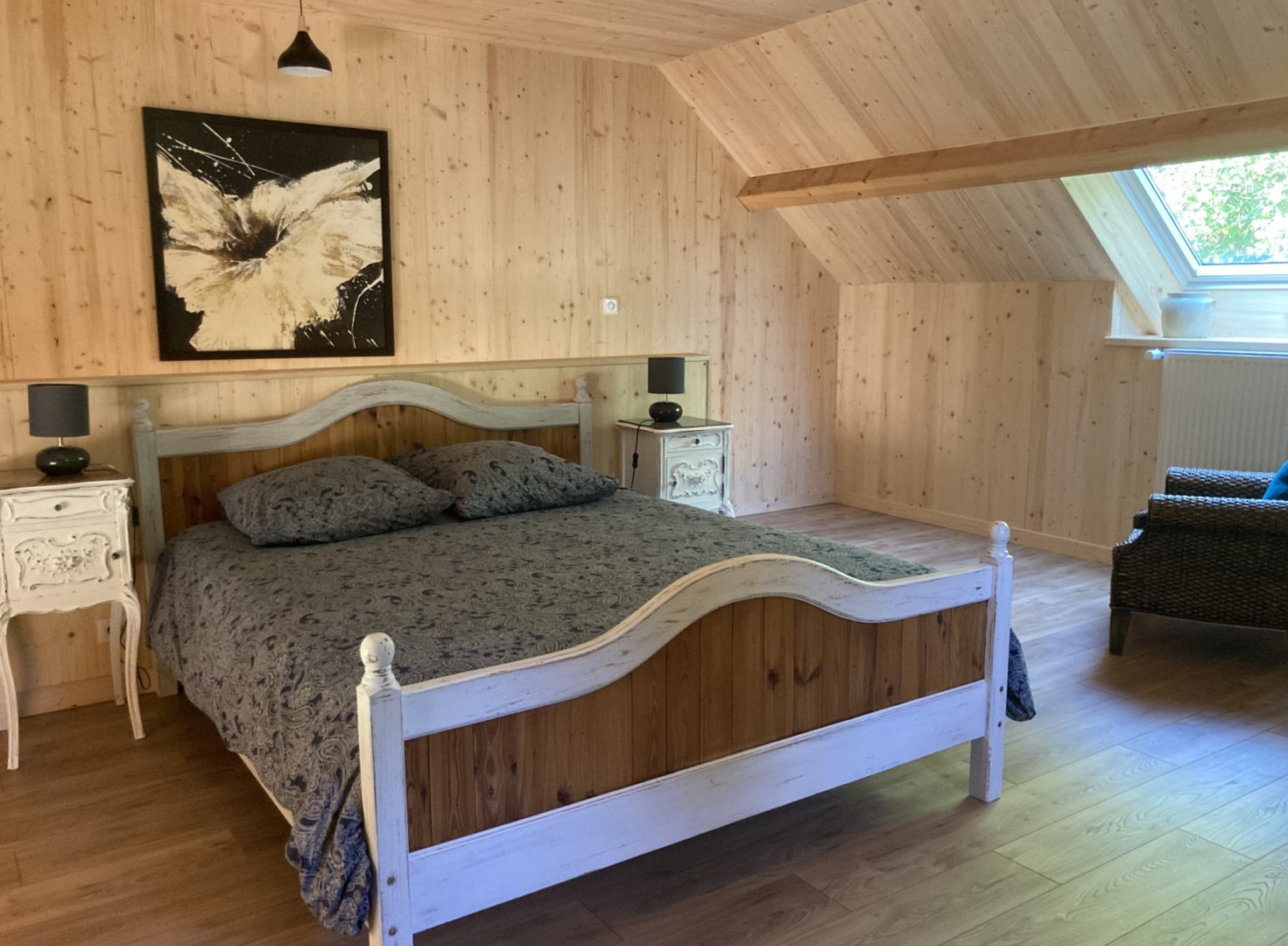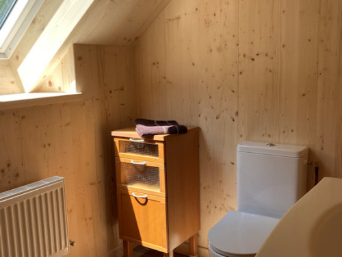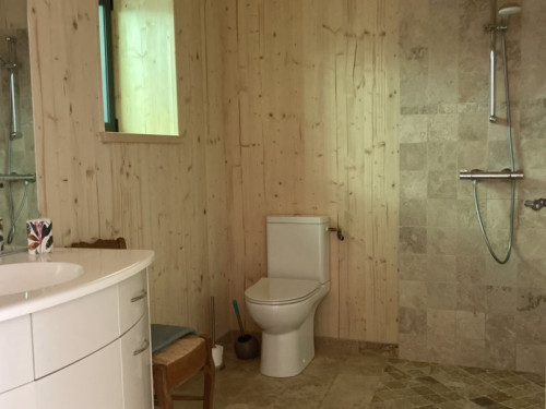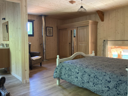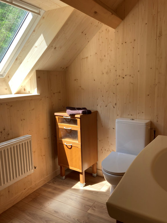 Upstairs we find the large bedroom with a 160 cm bed and its bathroom (toilet and vanity unit), a wardrobe, armchairs and bookcase. View of the river and the park.