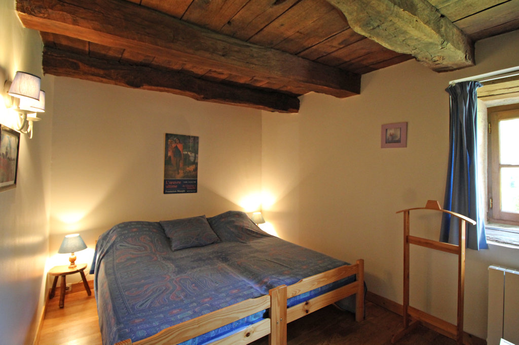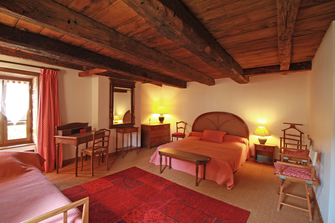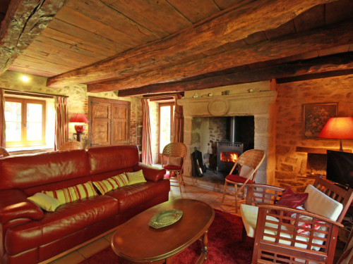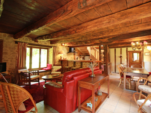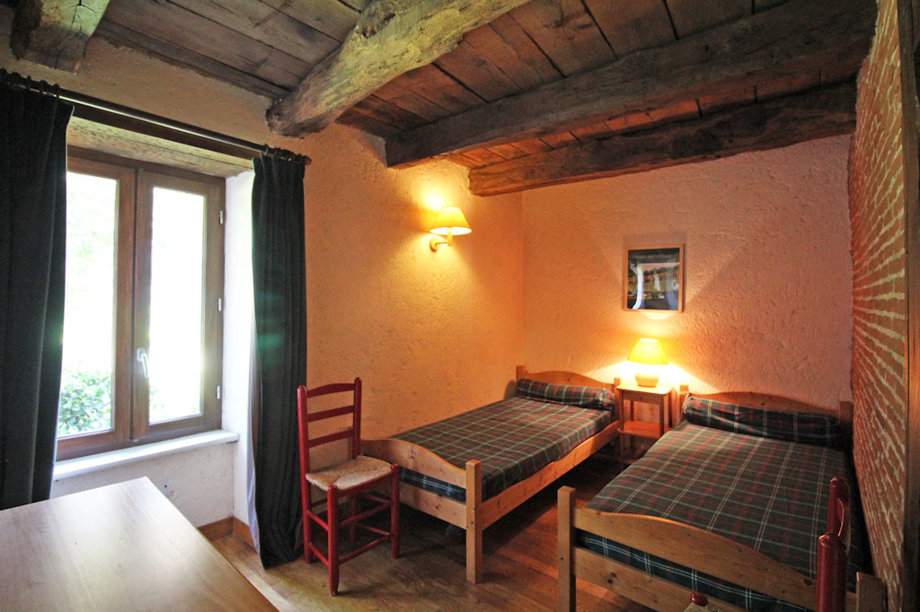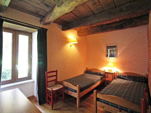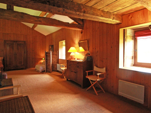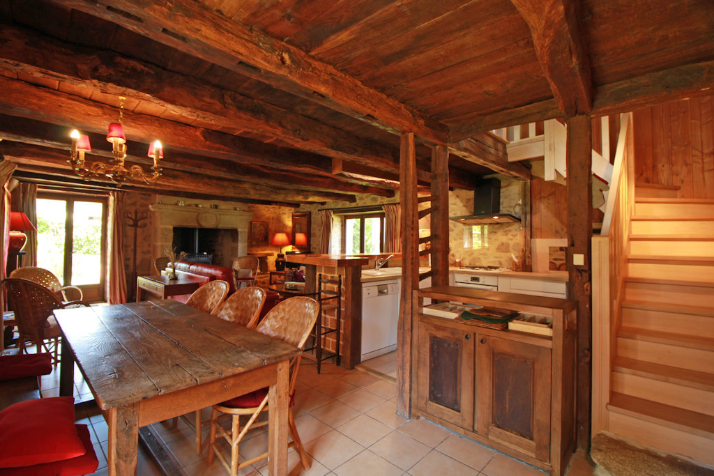 • au rez-de-chaussée : un grand séjour avec salon (cheminée en pierre, poêle à bois), salle à manger et cuisine équipée, deux chambres doubles (2×2 lits de 0,90 × 2 m), une salle de bain et des toilettes séparées.