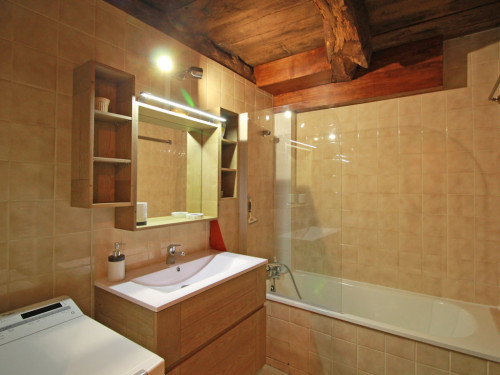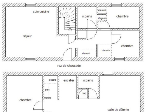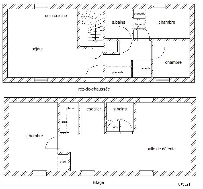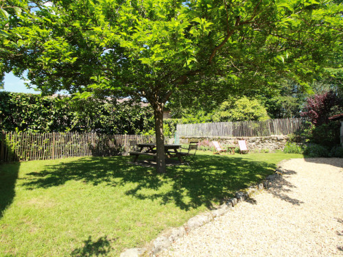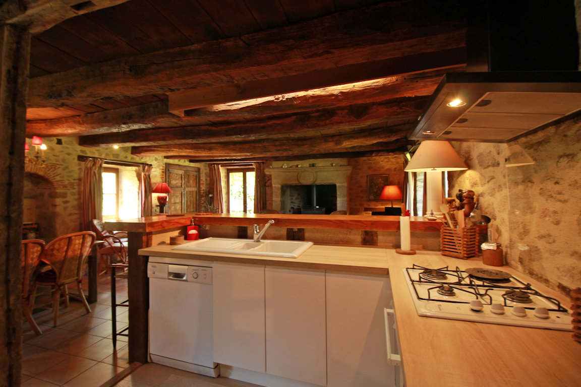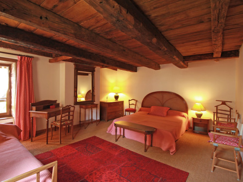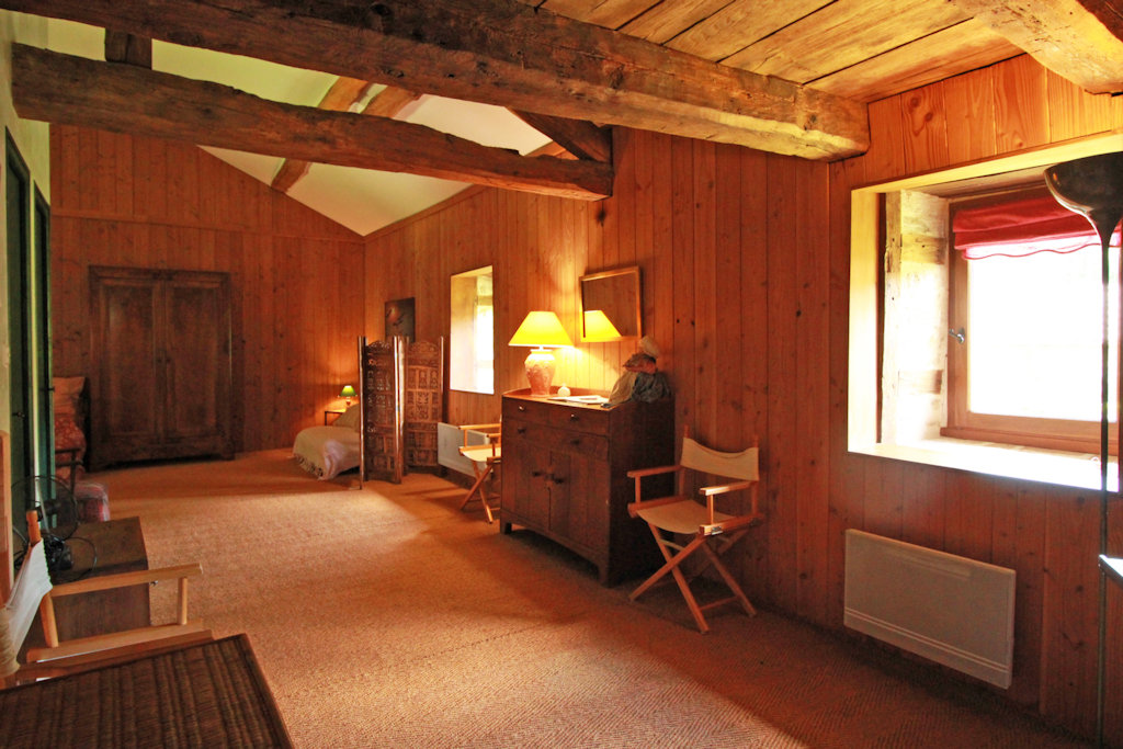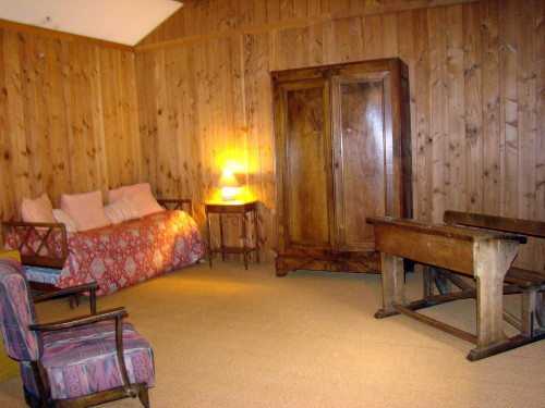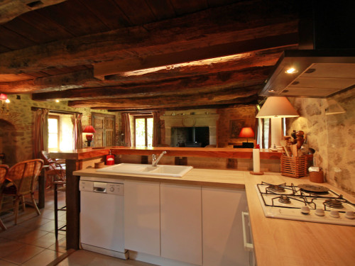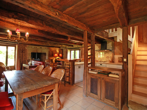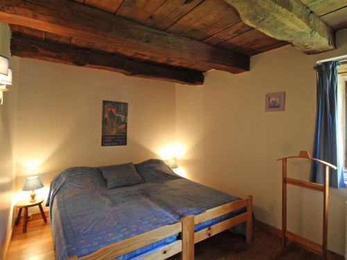 • au rez-de-chaussée : un grand séjour avec salon (cheminée en pierre, poêle à bois), salle à manger et cuisine équipée, deux chambres doubles (2×2 lits de 0,90 × 2 m), une salle de bain et des toilettes séparées.
