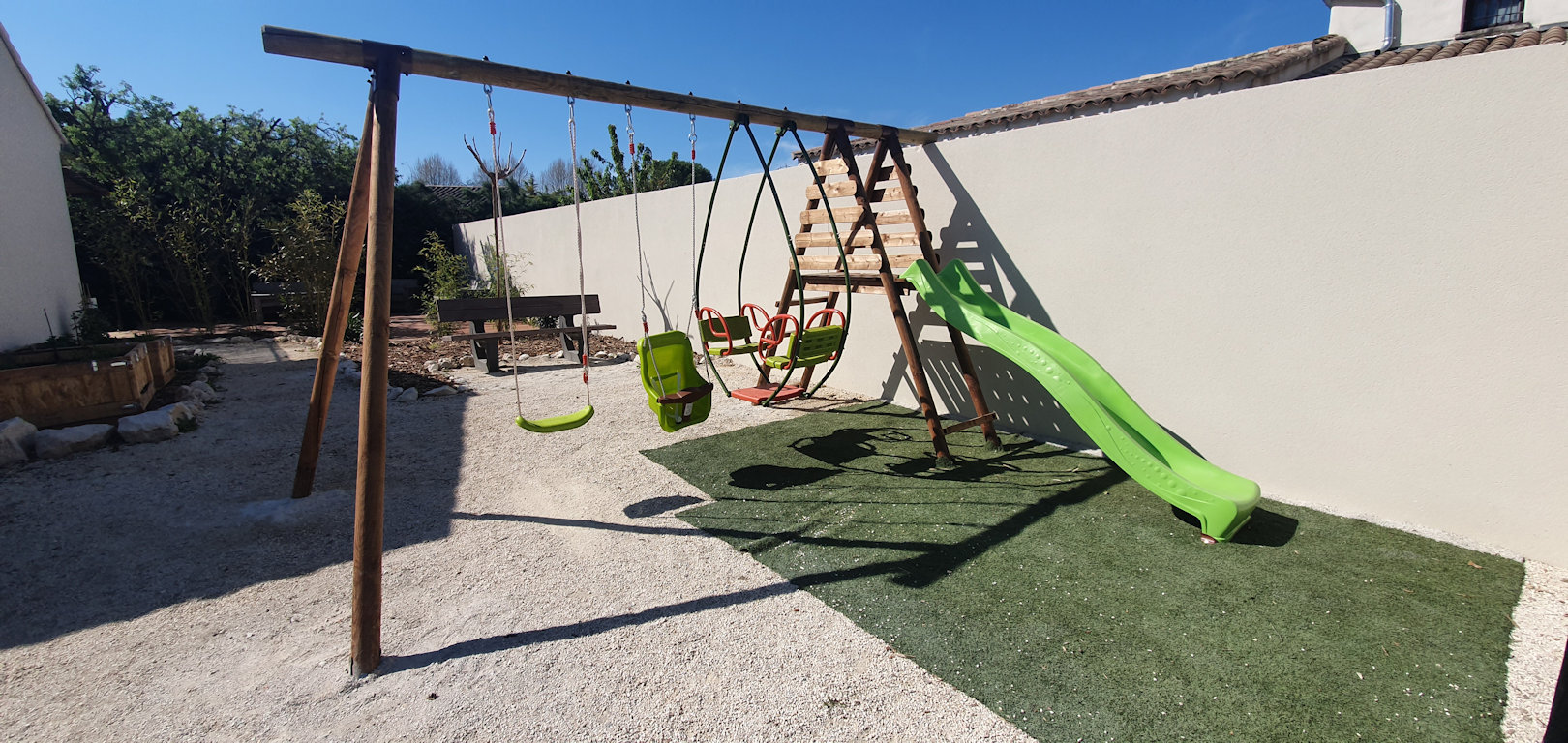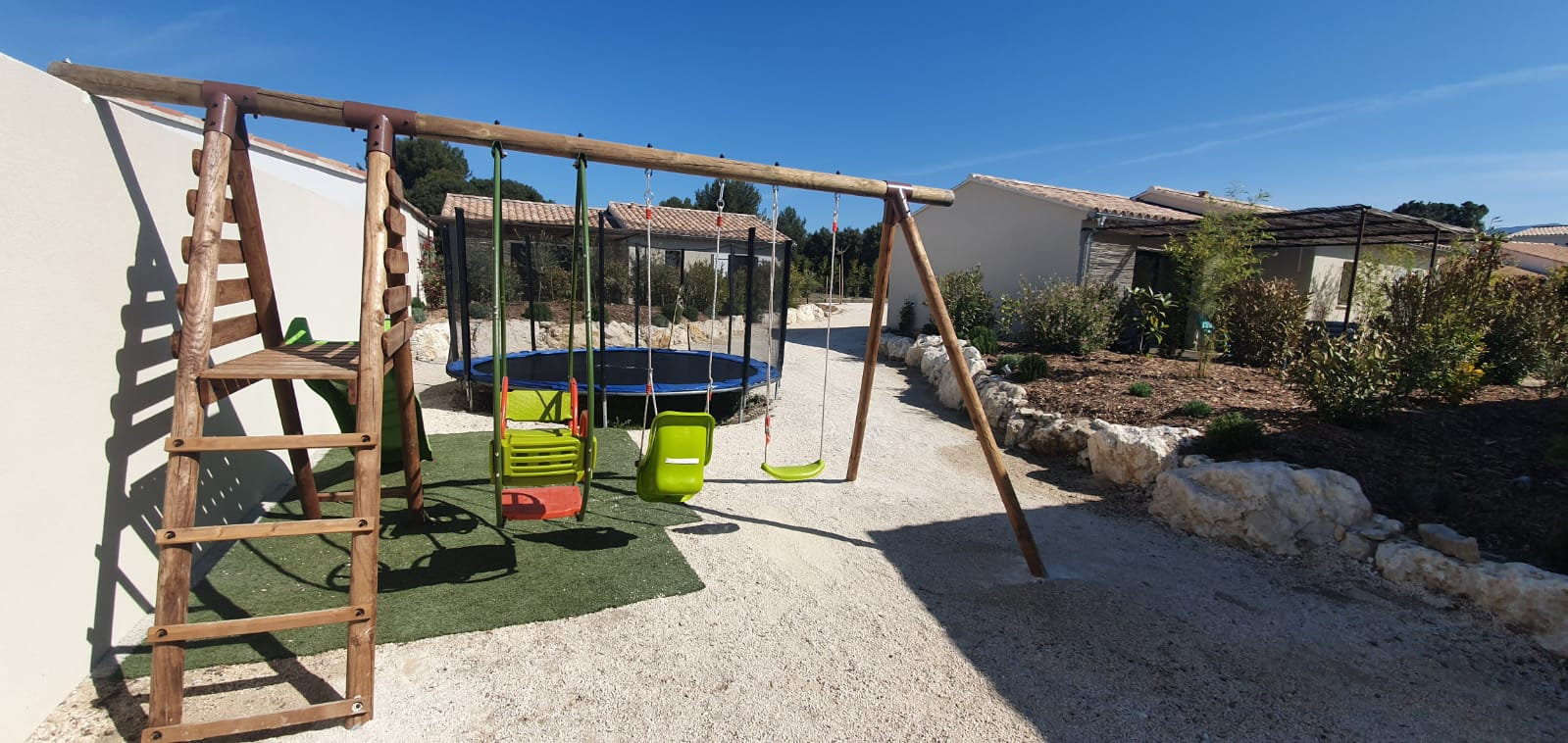 Beaucoup de verdure et de végétation aux abords des gîtes, un espace sans voiture autour des gîtes pour la sécurité des enfants.