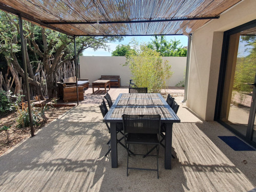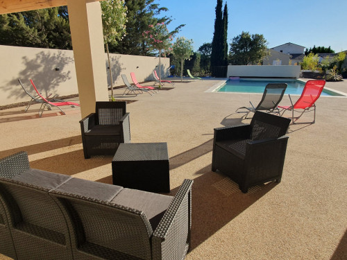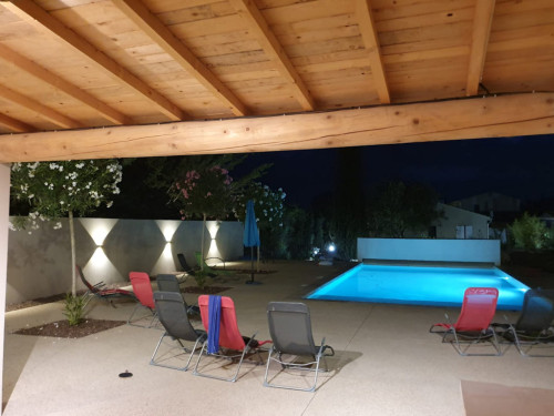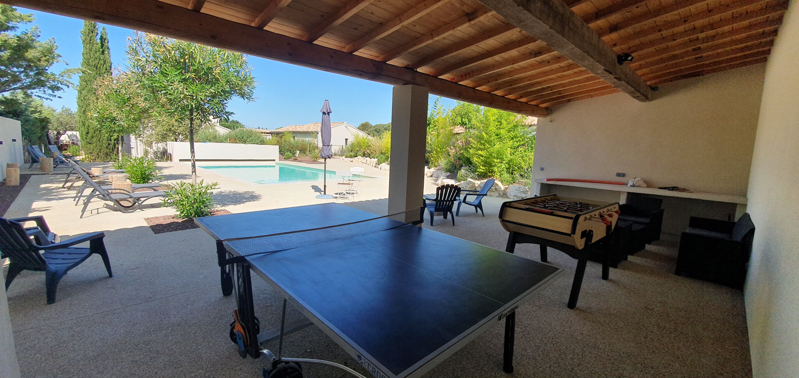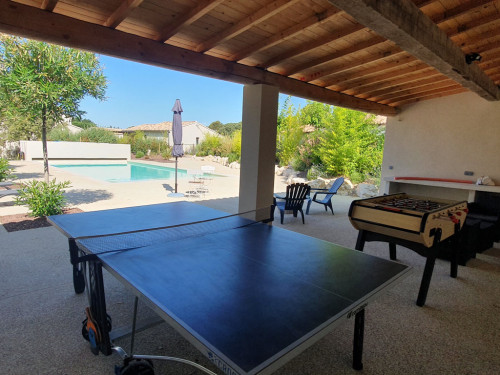 - une terrasse couverte au bord de la piscine avec baby-foot et table de tennis de table