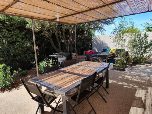 Une terrasse équipée avec table et chaises ainsi qu'une plancha à gaz.