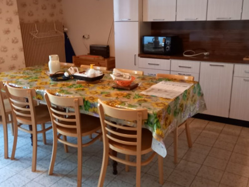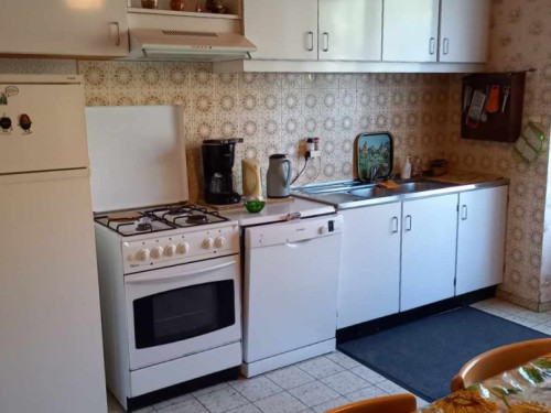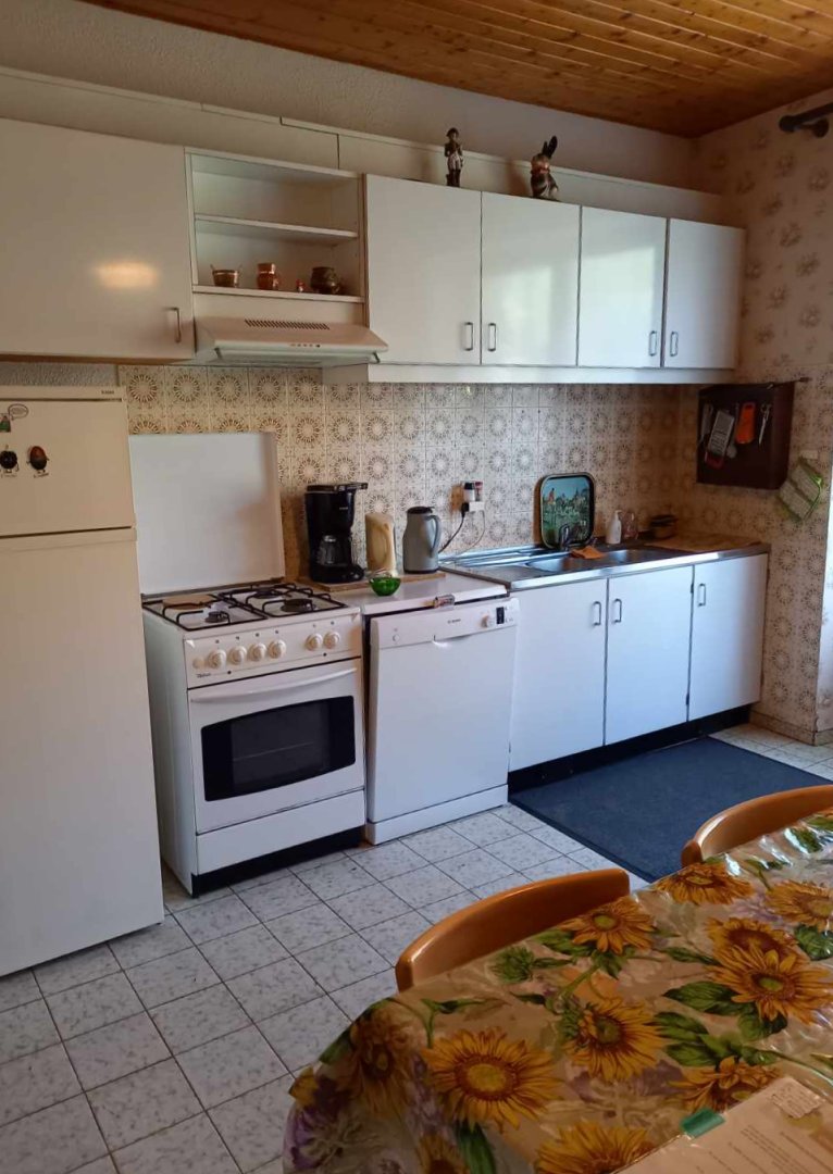 - d'une cuisine de 16 m² aménagés avec lave-vaisselle, cuisinière mixte, hotte, frigo-congélateur, micro-ondes, appareil à raclette, fondue et tout le nécessaire ; celle-ci donne sur une terrasse avec barbecue et salon de jardin