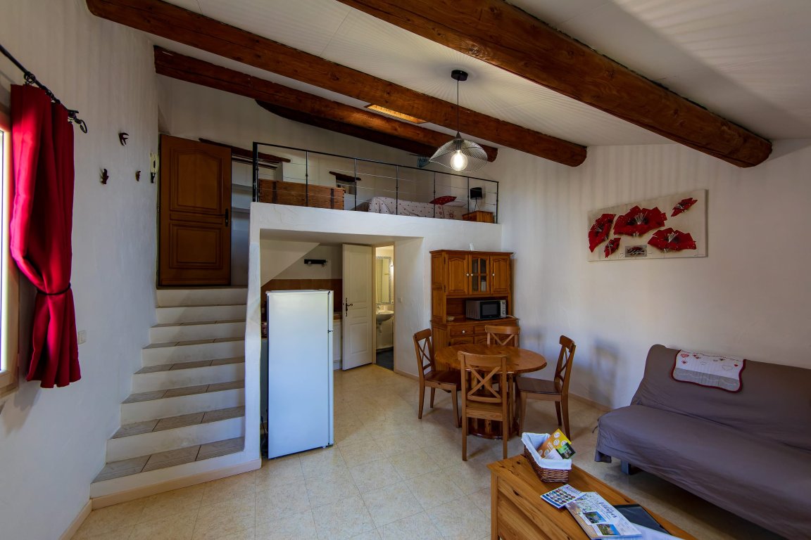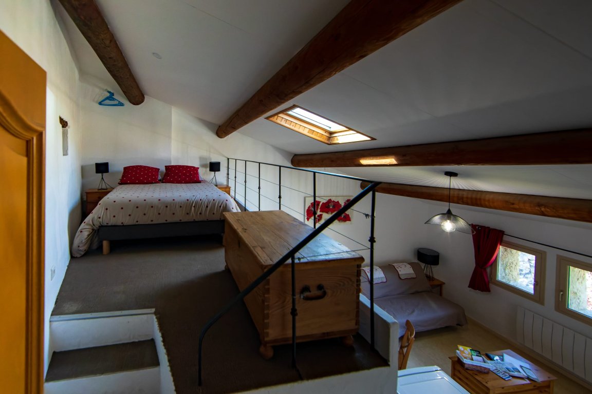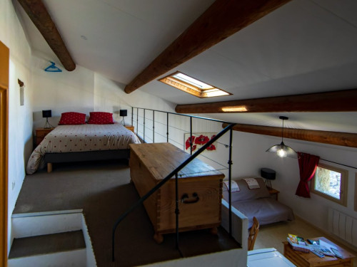 Douillet et confortable, ce grand studio mansardé se situe au second étage de la propriété. Après une journée de randonnée ou de découverte, la chambre cosy en mezzanine vous invitera à un repos bien mérité.