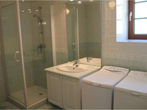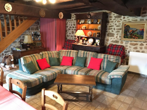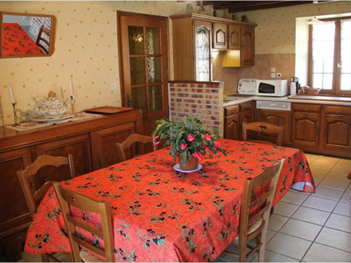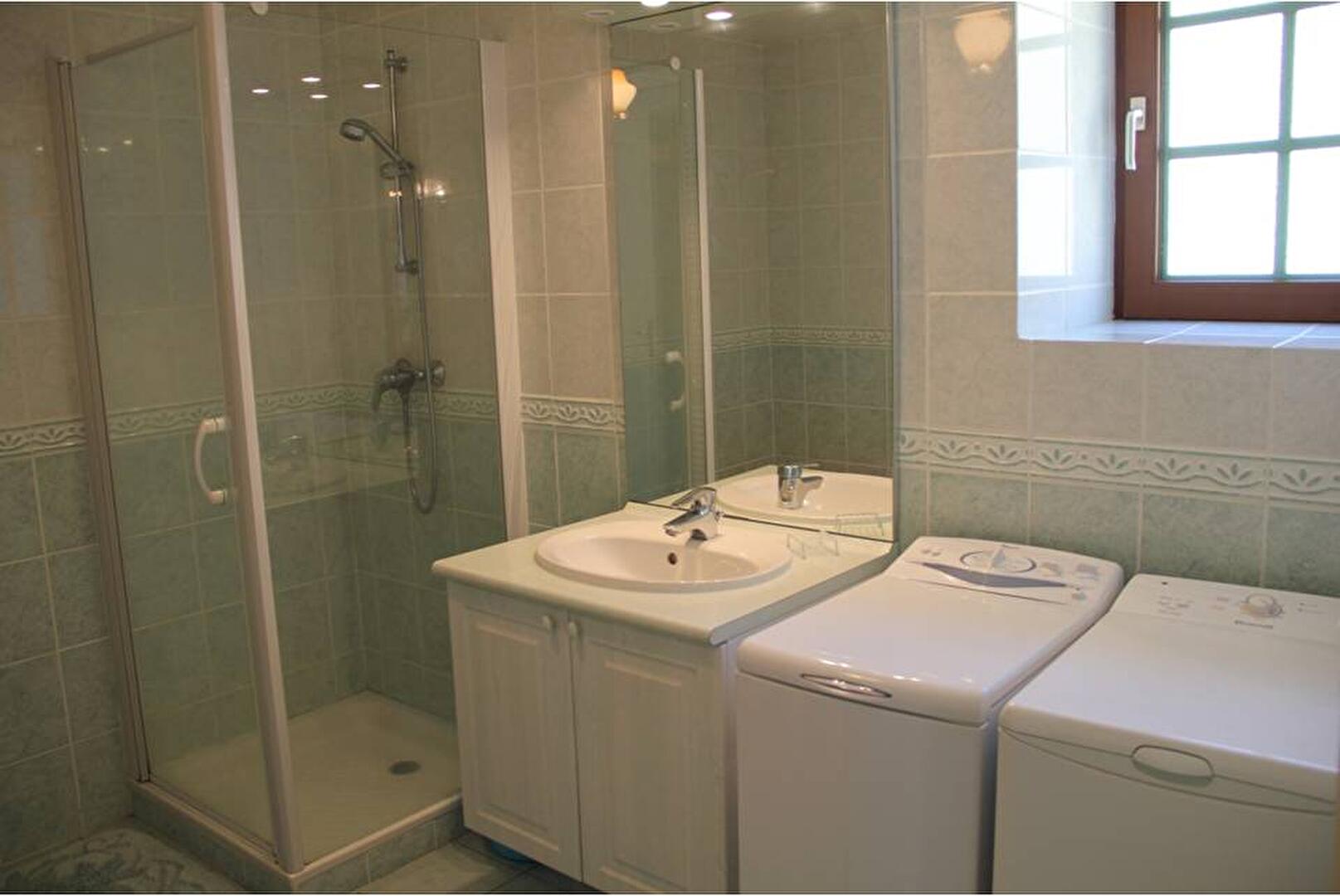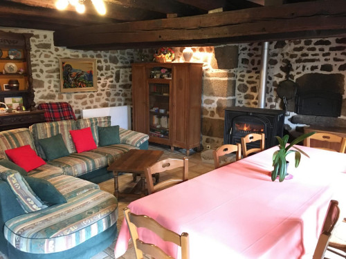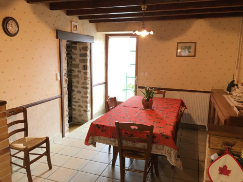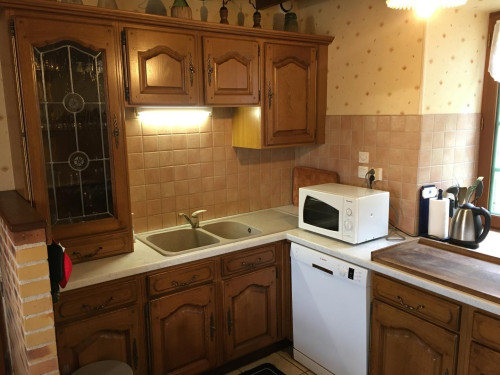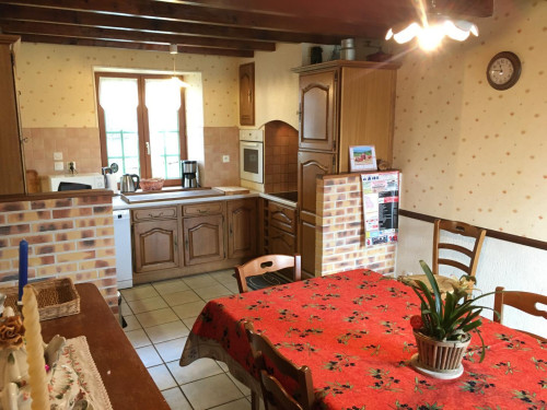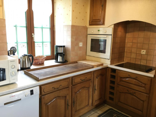 Rez-de-chaussée : cuisine équipée avec espace repas (plaque et four électriques, micro-ondes, réfrigérateur et congélateur, lave-vaisselle), séjour-salon (poêle à bois, bibliothèque), CH 1 (2 lits simple 90), salle d'eau (lave-linge, sèche-linge), WC.