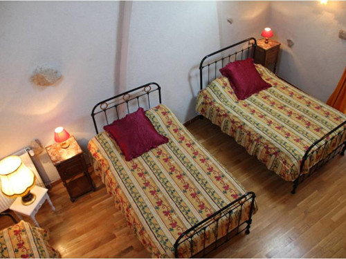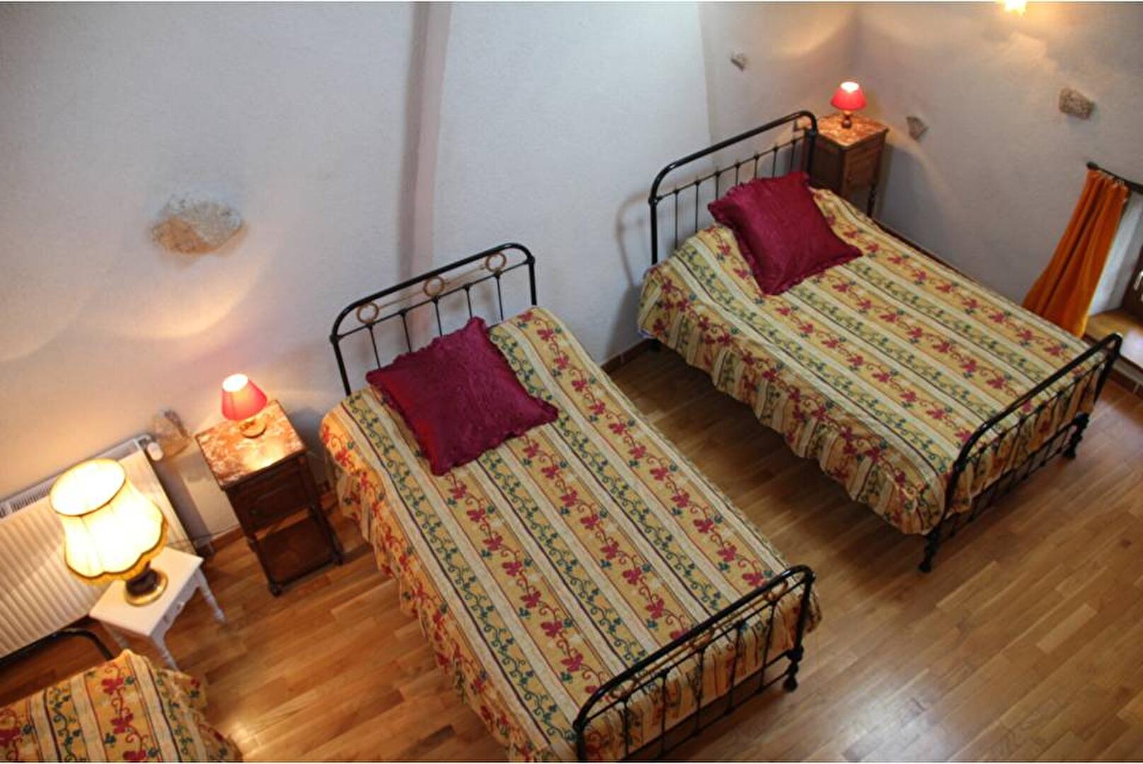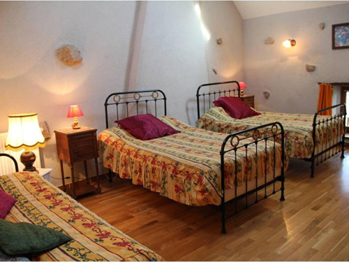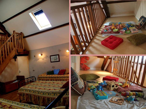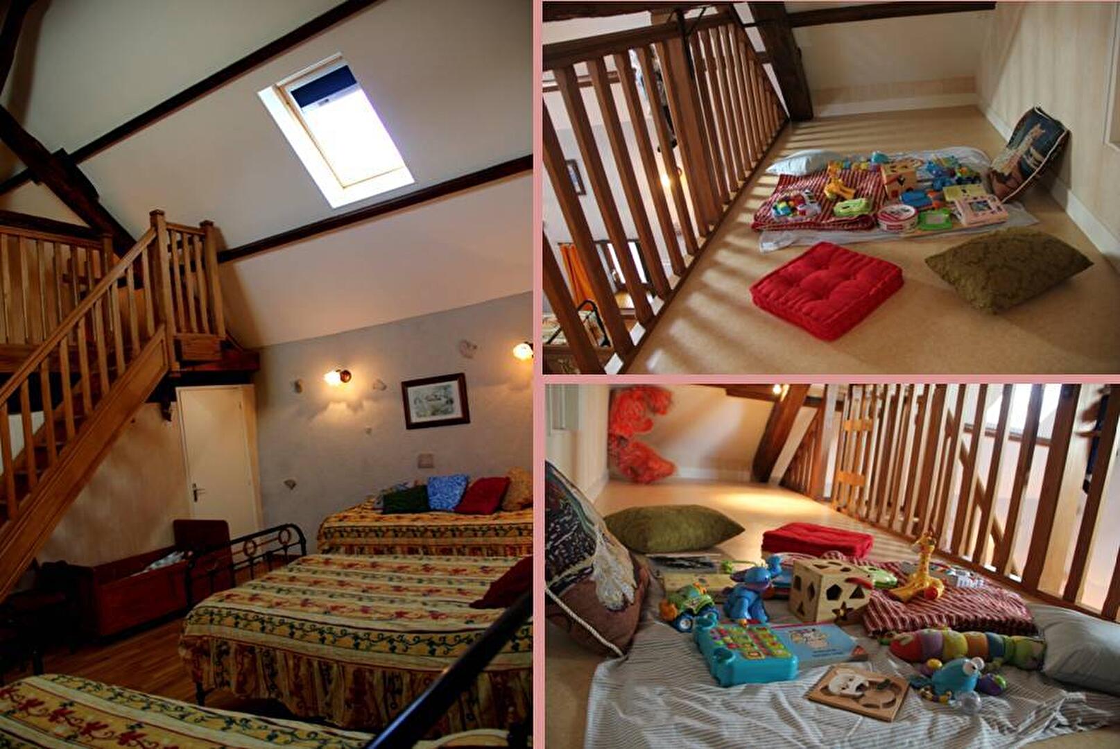 Étage : CH 2 (1 lit double 140 + 1 lit bébé), CH 3 (1 lit double 140), CH 4 (1 lit 1 place en 110, 1 lit 1 place en 120, 1 lit 90, 1 lit enfant pour moins de 2 ans) avec coin jeu en mezzanine, salle de bains, WC.