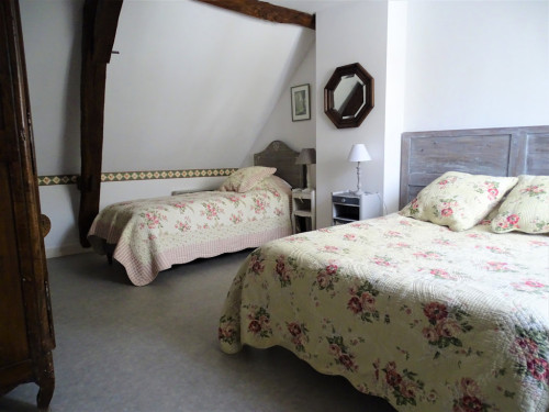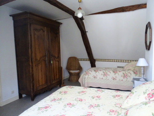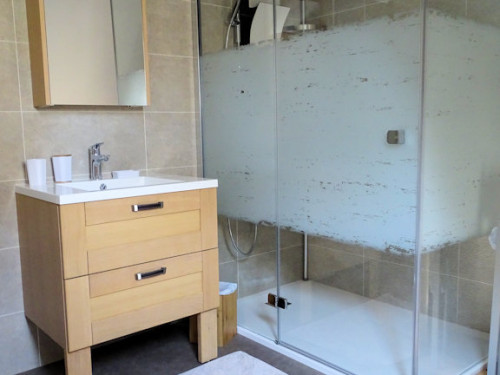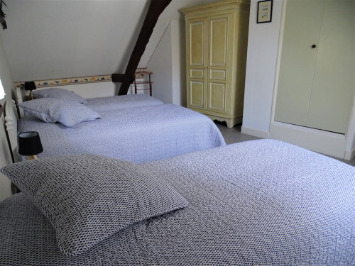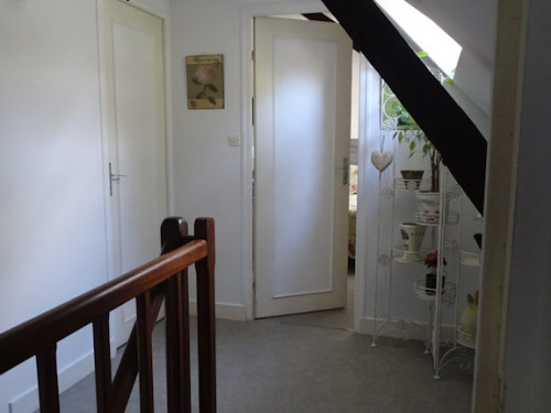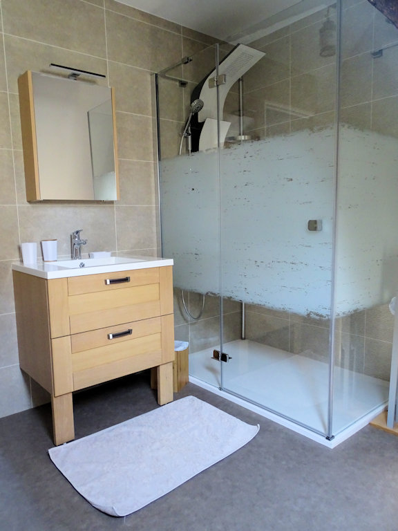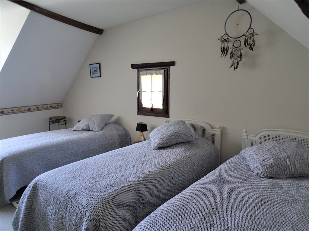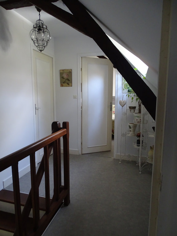 Un escalier conduit à un palier qui donne accès à deux chambres : une parentale avec un lit en 140 et un autre en 90 ; une deuxième chambre avec trois lits en 90 (dont deux peuvent être jumelés) ainsi qu’une salle de bain équipée d’une grande douche balnéo et d’un WC.