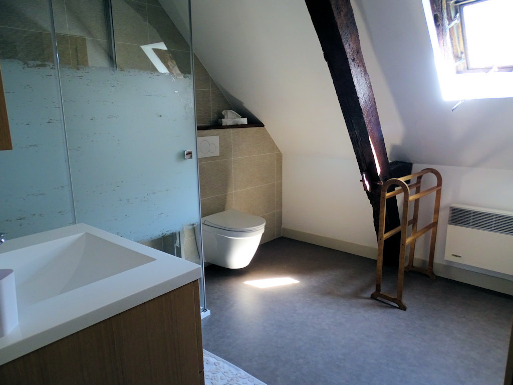 Situé dans la propriété du moulin et d’une superficie de 115 m², il est composé d’une grande entrée desservant la cuisine et le living qui ouvrent tous deux sur la terrasse