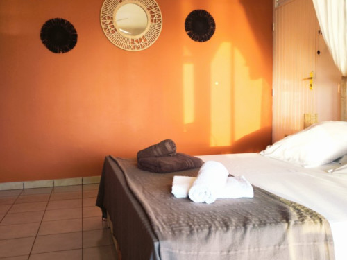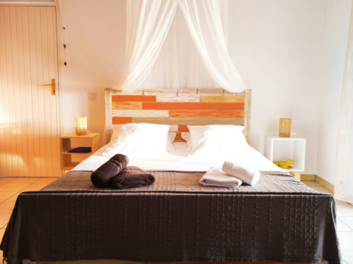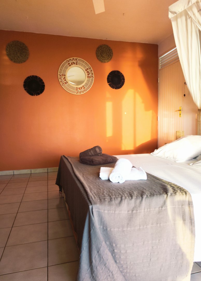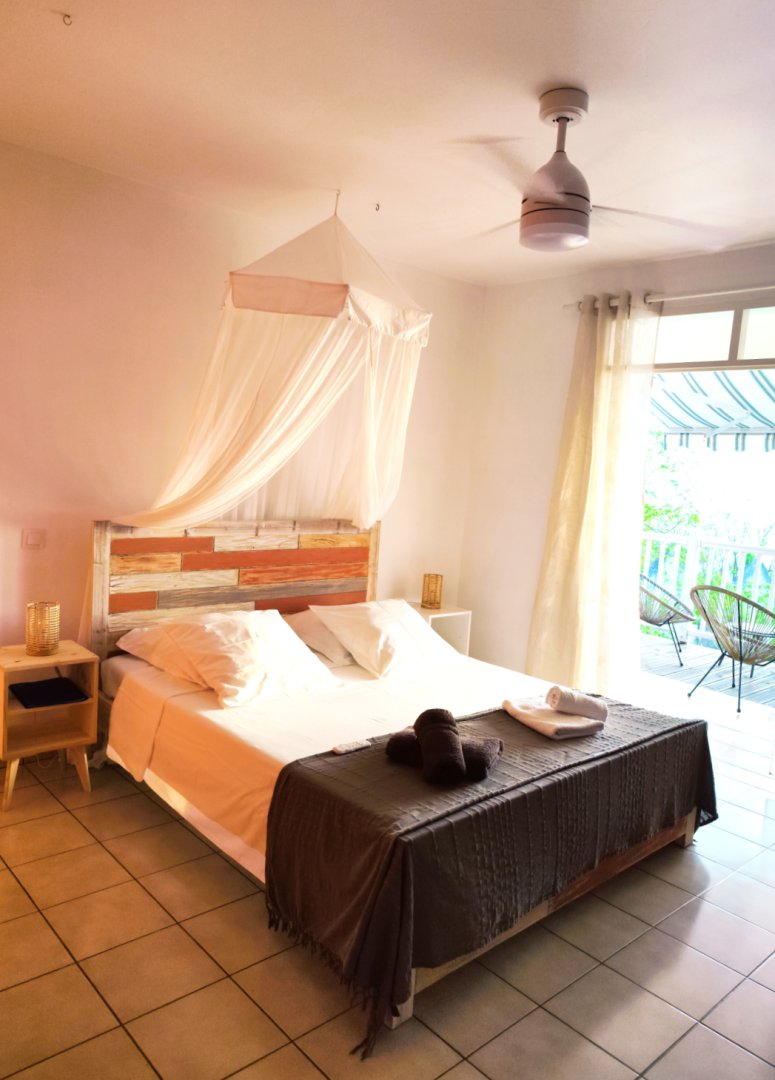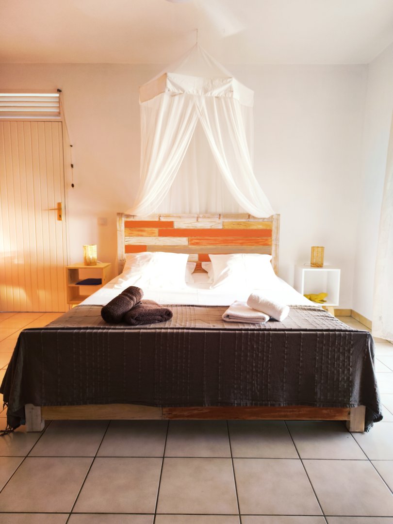 La chambre possède 1 lit de 160 x 190 cm et 1 lit de 90 x 190 cm (max 3 pers), climatisé, moustiquaire et brasseur d'air au plafond, hamac et rangements.