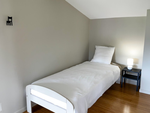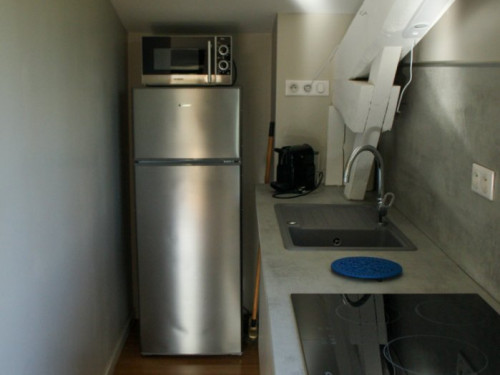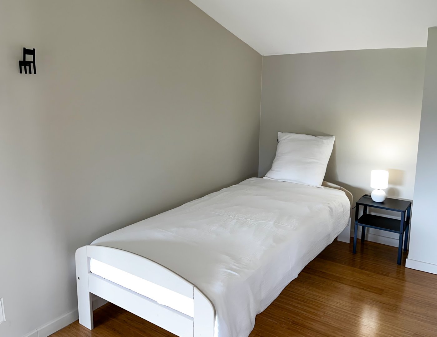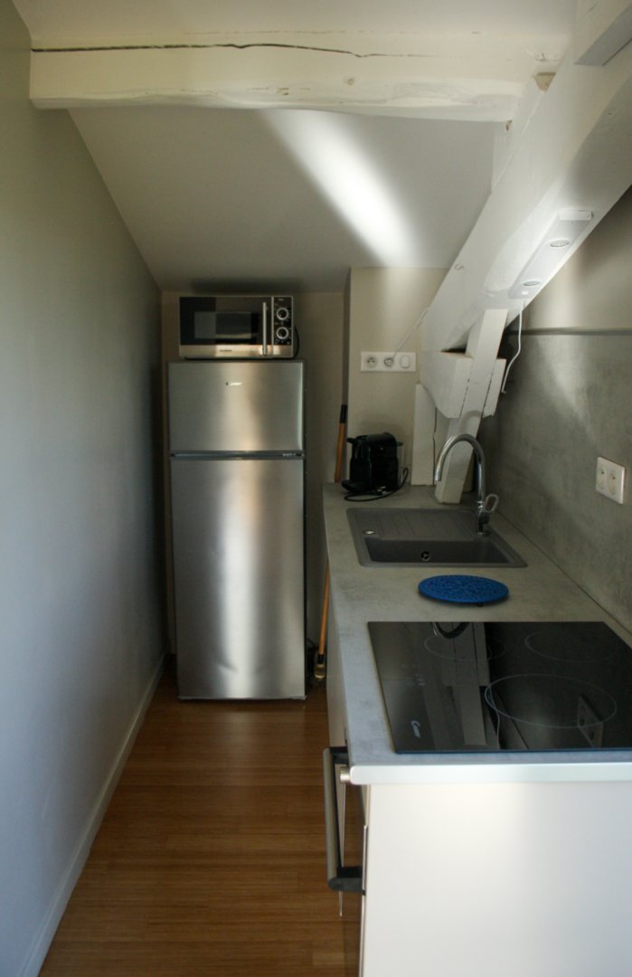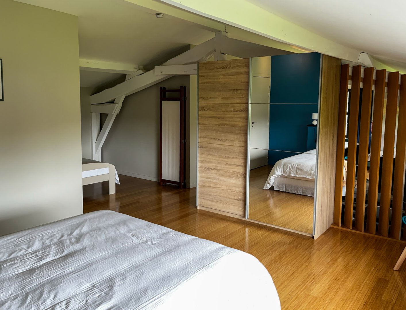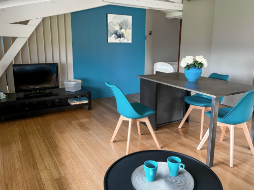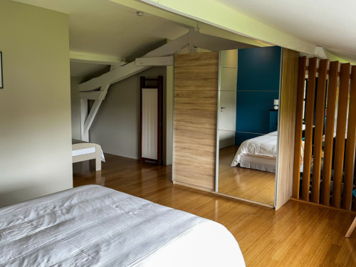 Entrée privée par escalier extérieur, découvrez un espace de vie avec une cuisine ouverte, une zone chambre avec un lit spacieux de 160x200, et un coin nuit équipé d'un lit de 90x200, avec la possibilité d'ajouter un lit bébé.