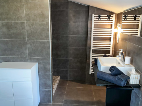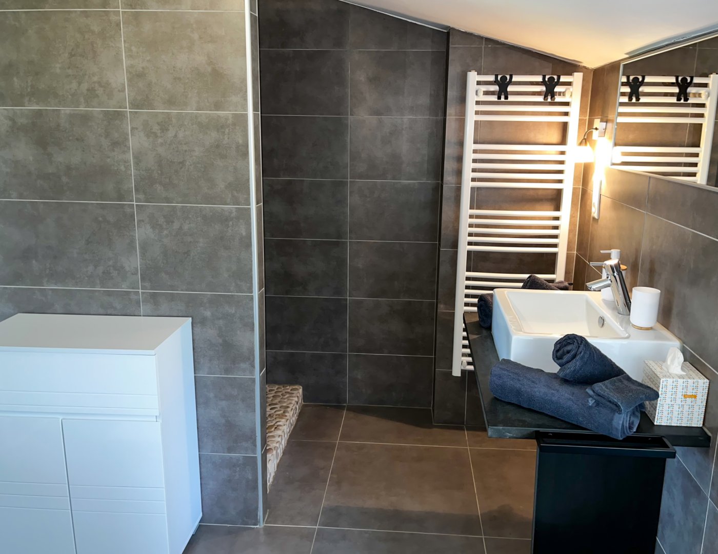 La salle de bain offre une expérience relaxante avec une baignoire balnéo, une grande douche, un lavabo et des toilettes.