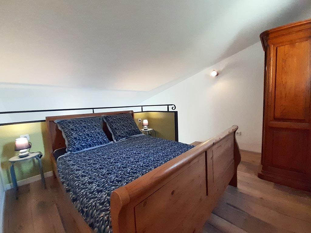 - Chambre à coucher en mezzanine avec literie en 140×200 et armoire