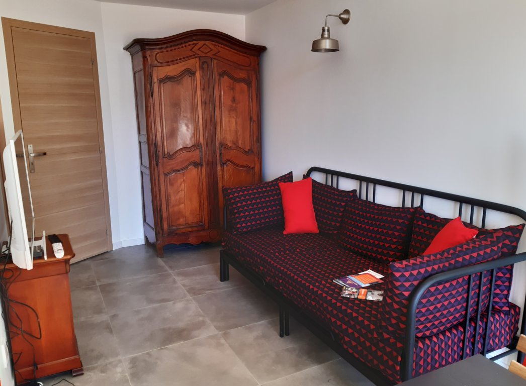 - d’une belle pièce à vivre avec un coin salon composé d’un canapé lit et d’un coin repas pouvant accueillir 4 personnes,