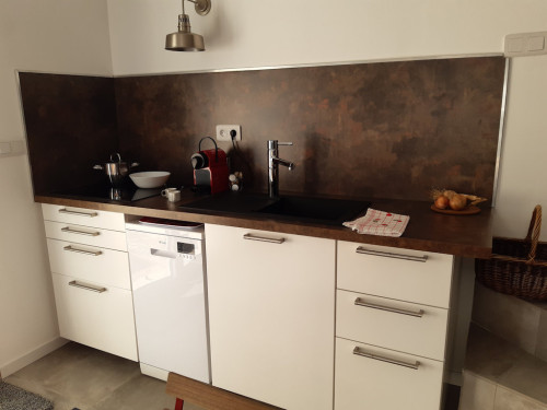 - d’une cuisine ouverte très bien équipée : frigo/congélateur, lave-vaisselle, plaque de cuisson à induction, four à micro-ondes combiné, machine à café Nespresso, grille-pain, bouilloire