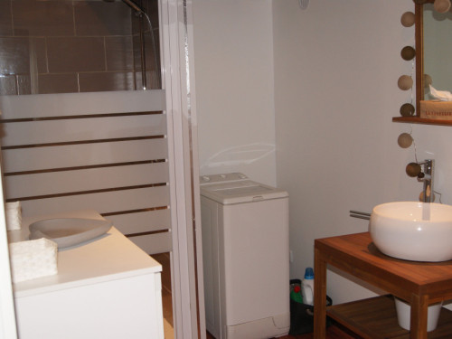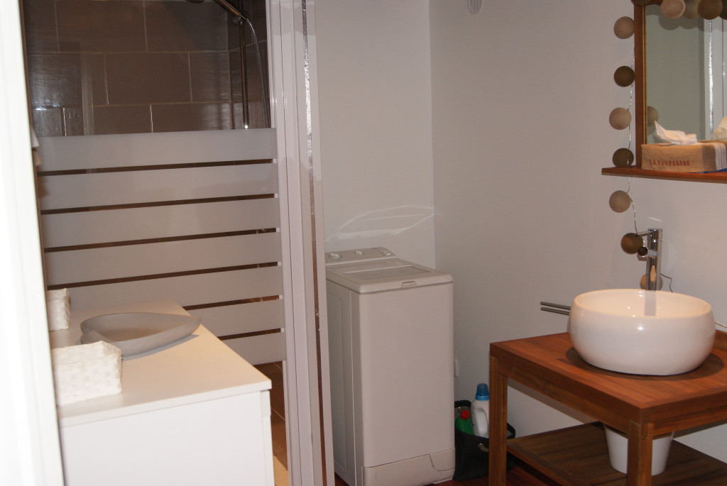 Une salle d’eau avec douche et WC, accessible par la deuxième chambre