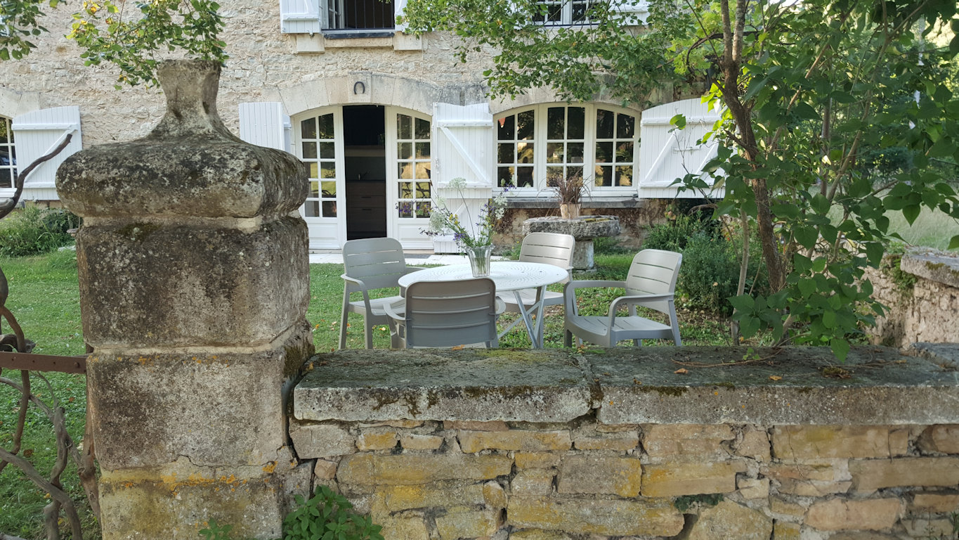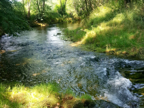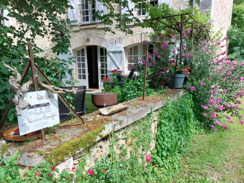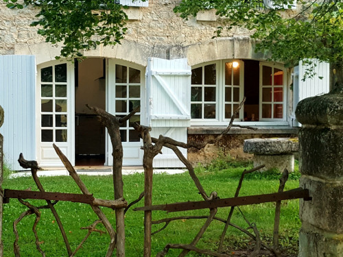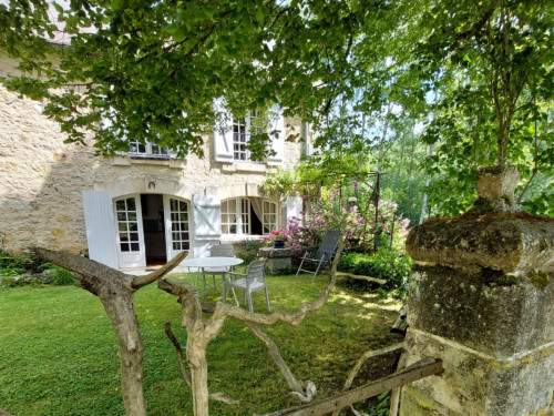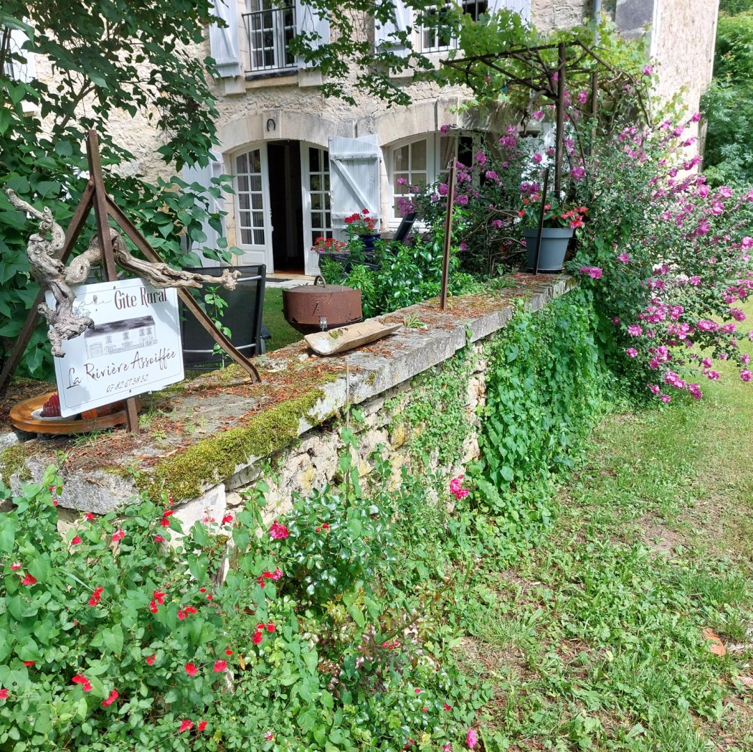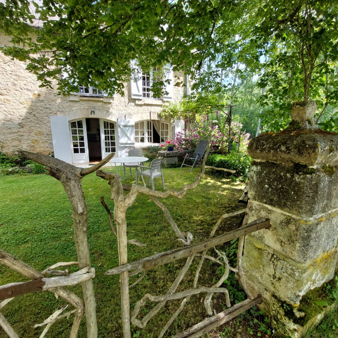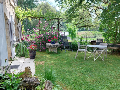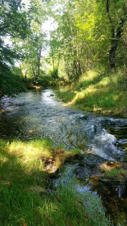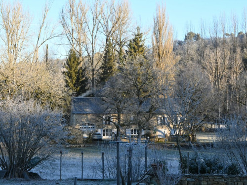 La maison est à l'écart du village (200 m), au bord de la rivière quelques fois en manque d'eau certains étés très chaud.