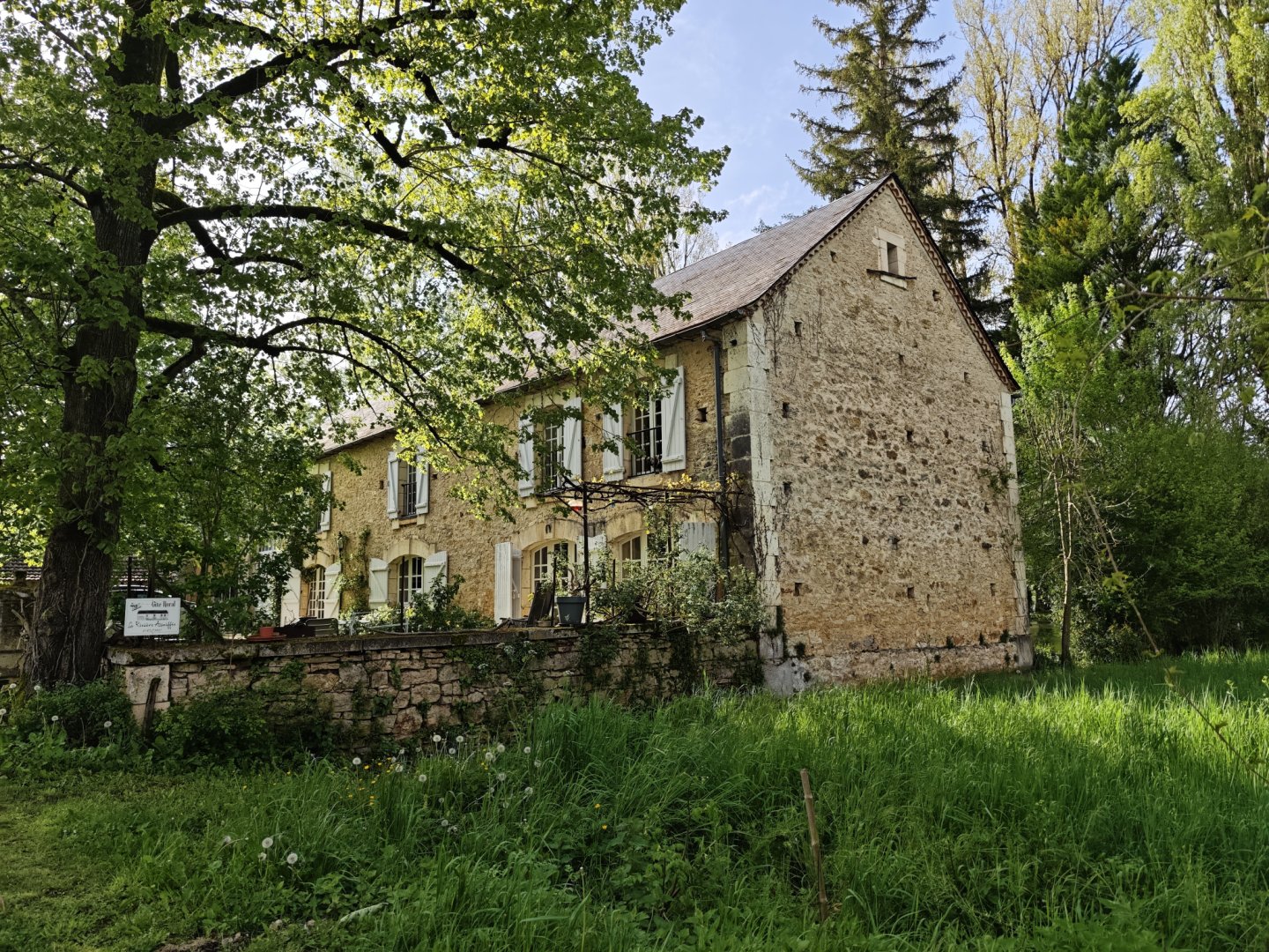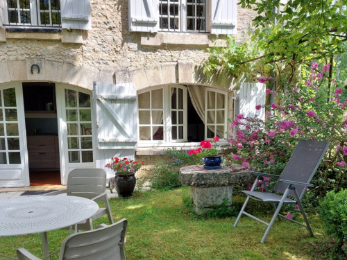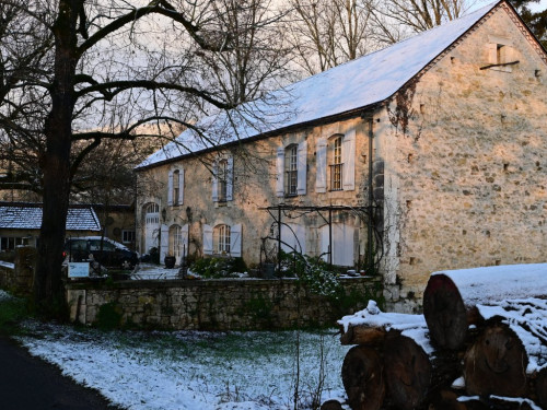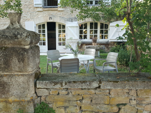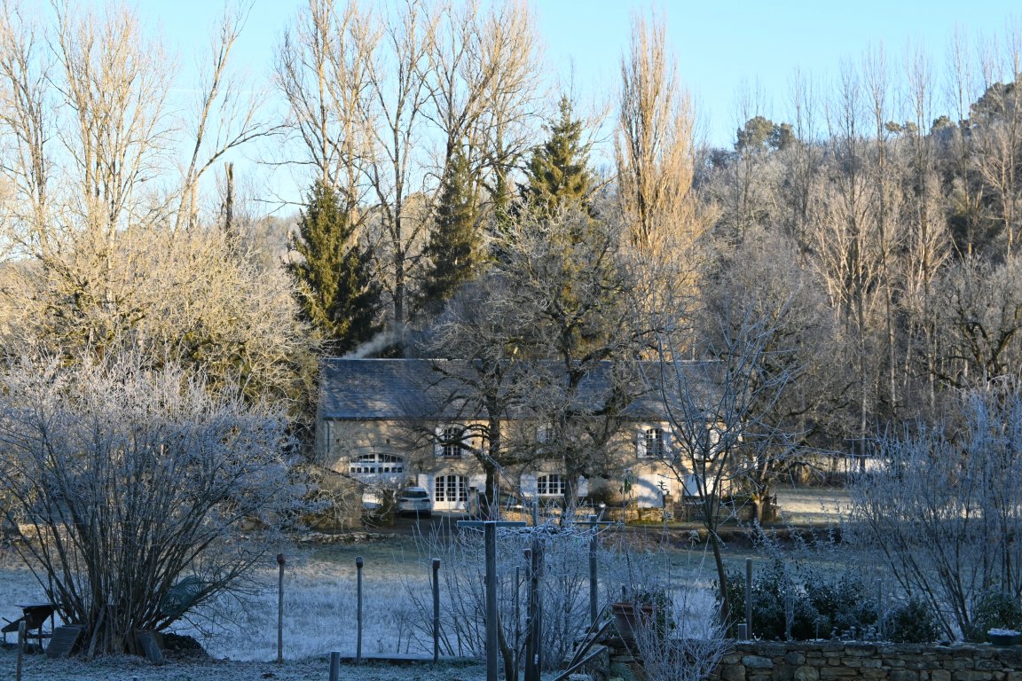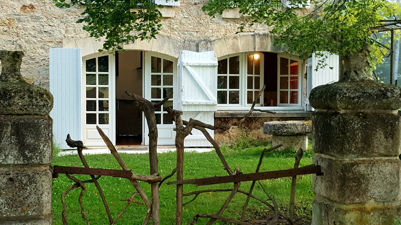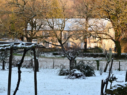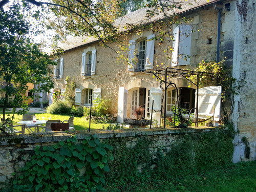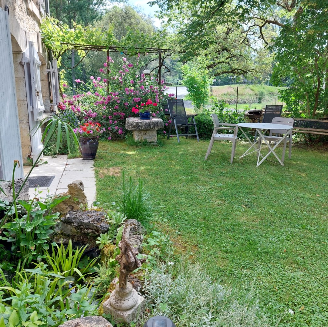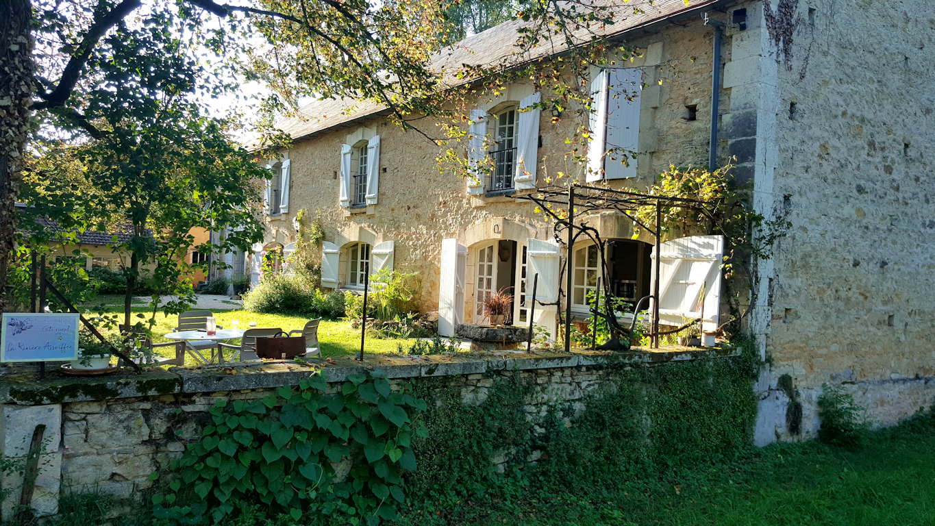 La maison est à l'écart du village (200 m), au bord de la rivière quelques fois en manque d'eau certains étés très chaud.