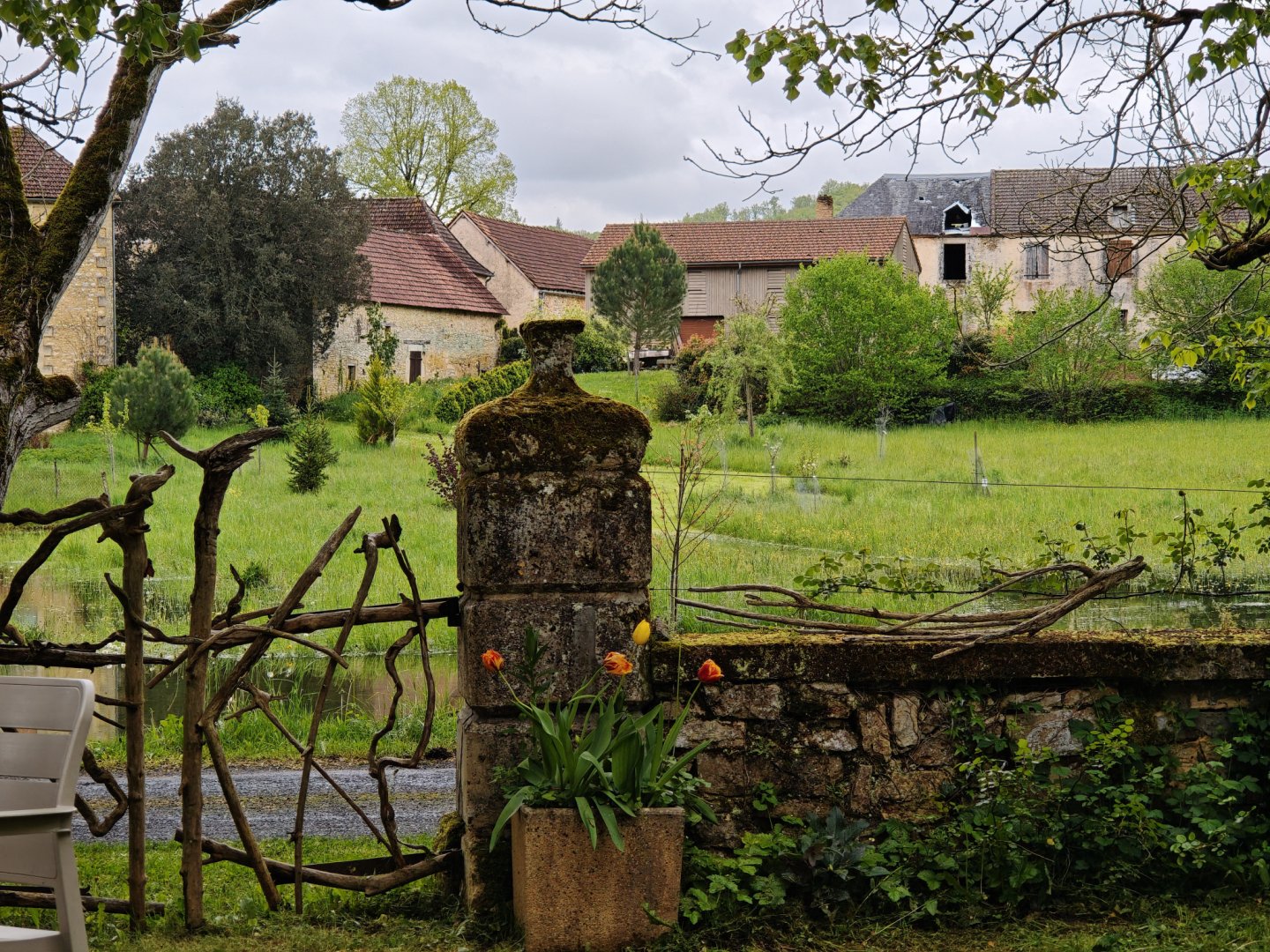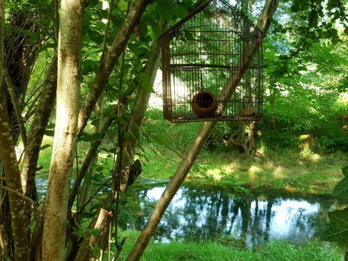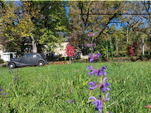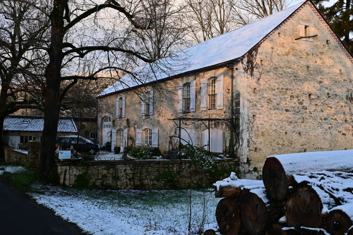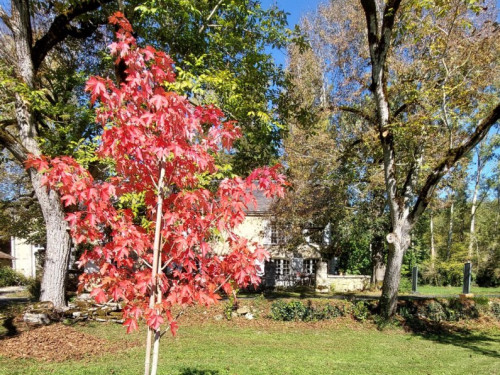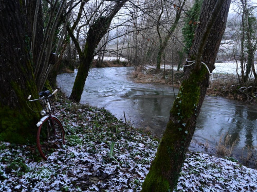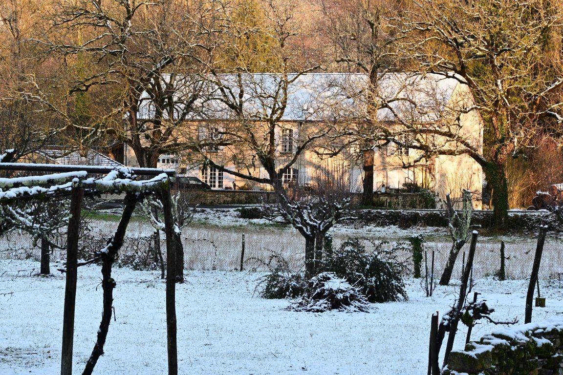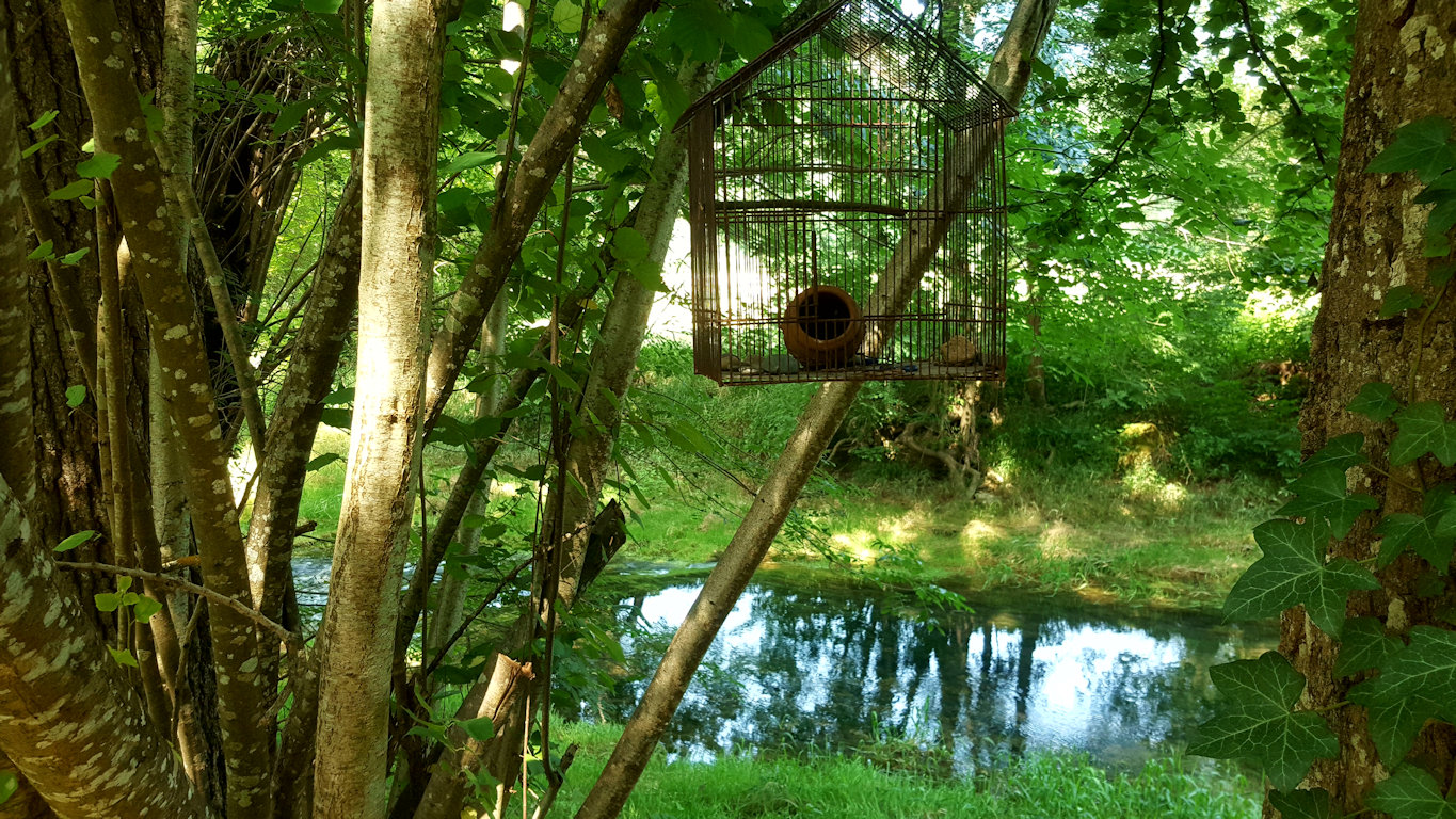 La maison est à l'écart du village (200 m), au bord de la rivière quelques fois en manque d'eau certains étés très chaud.