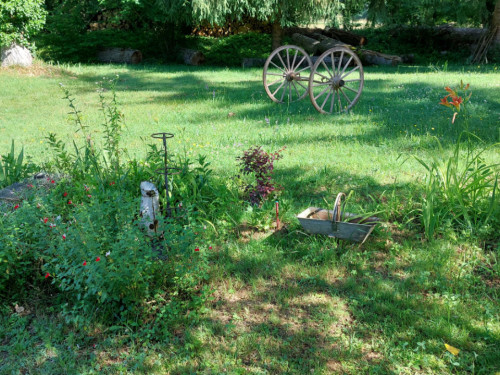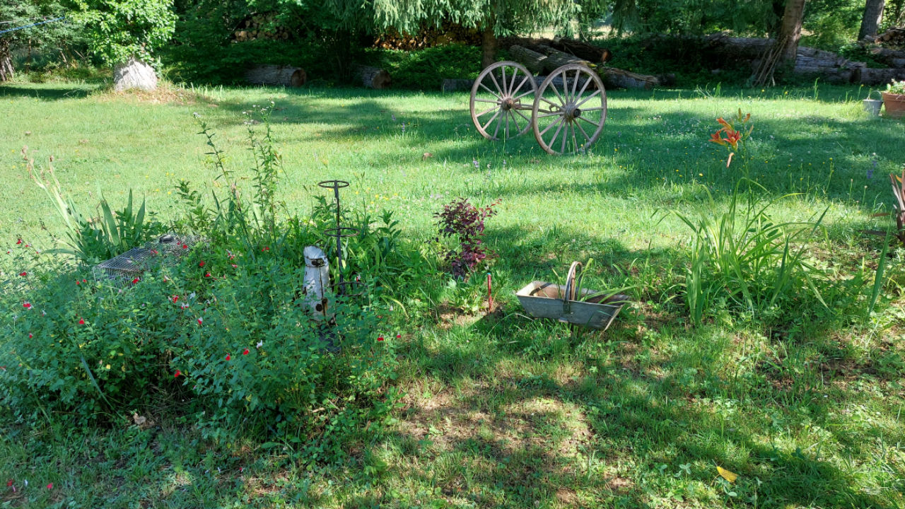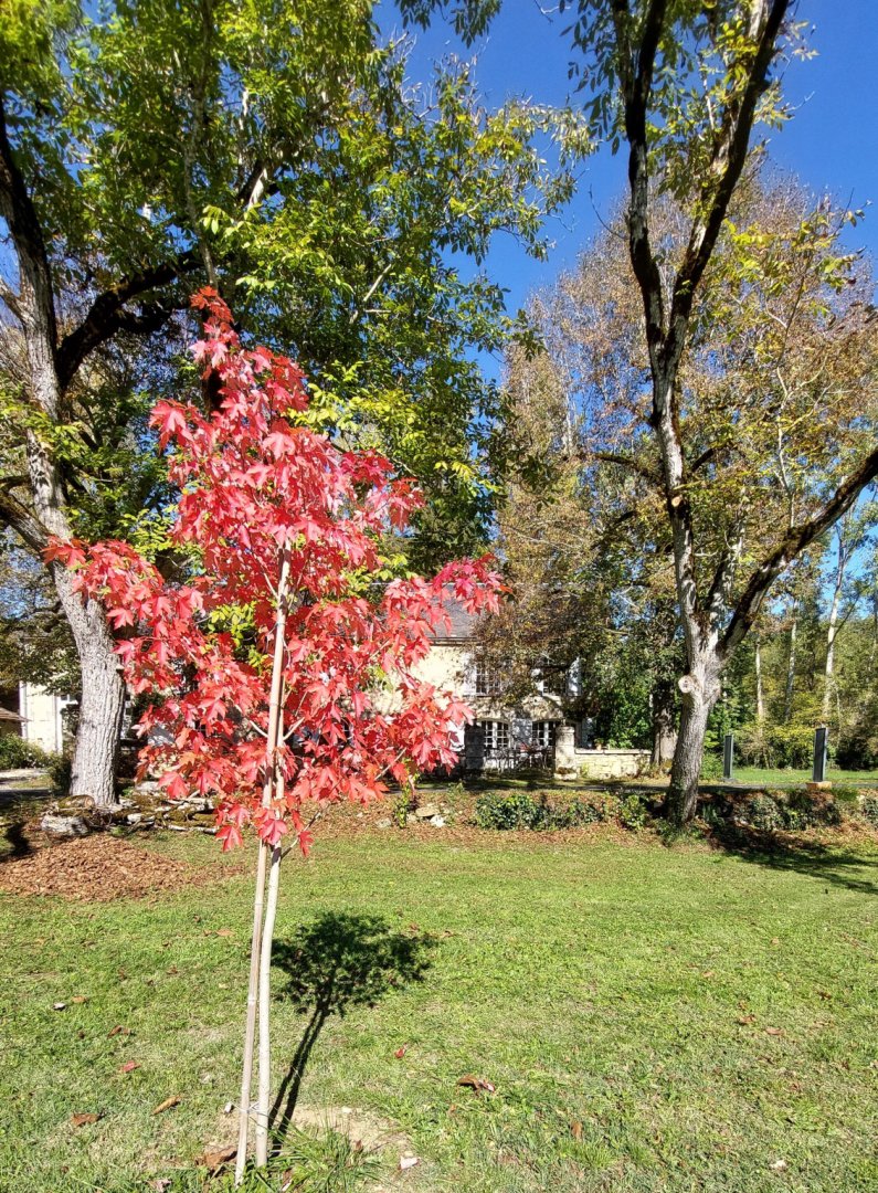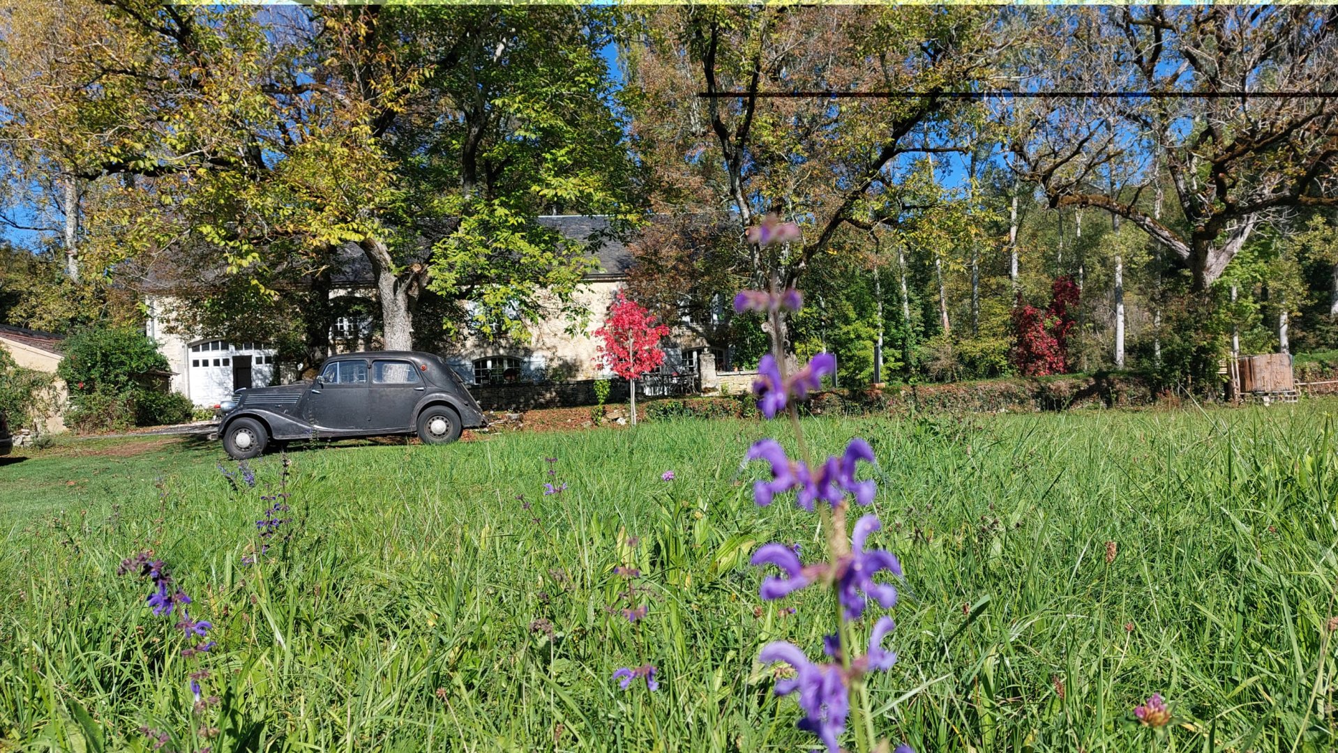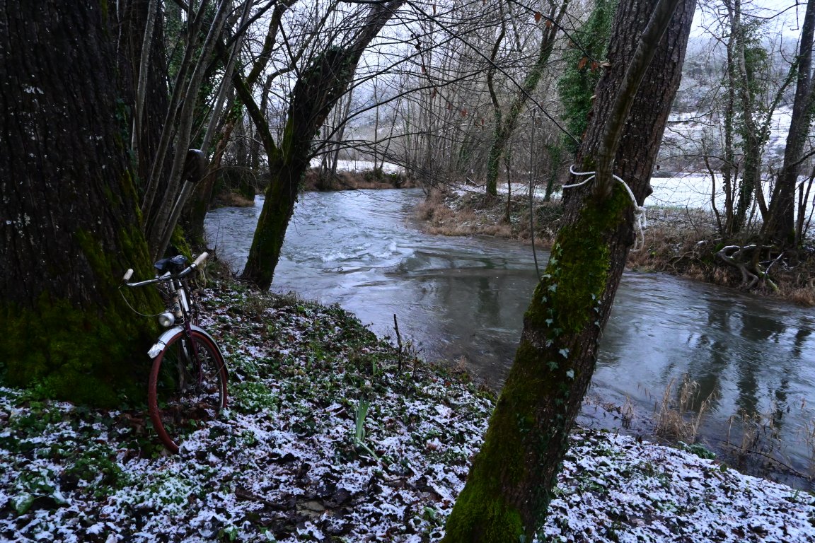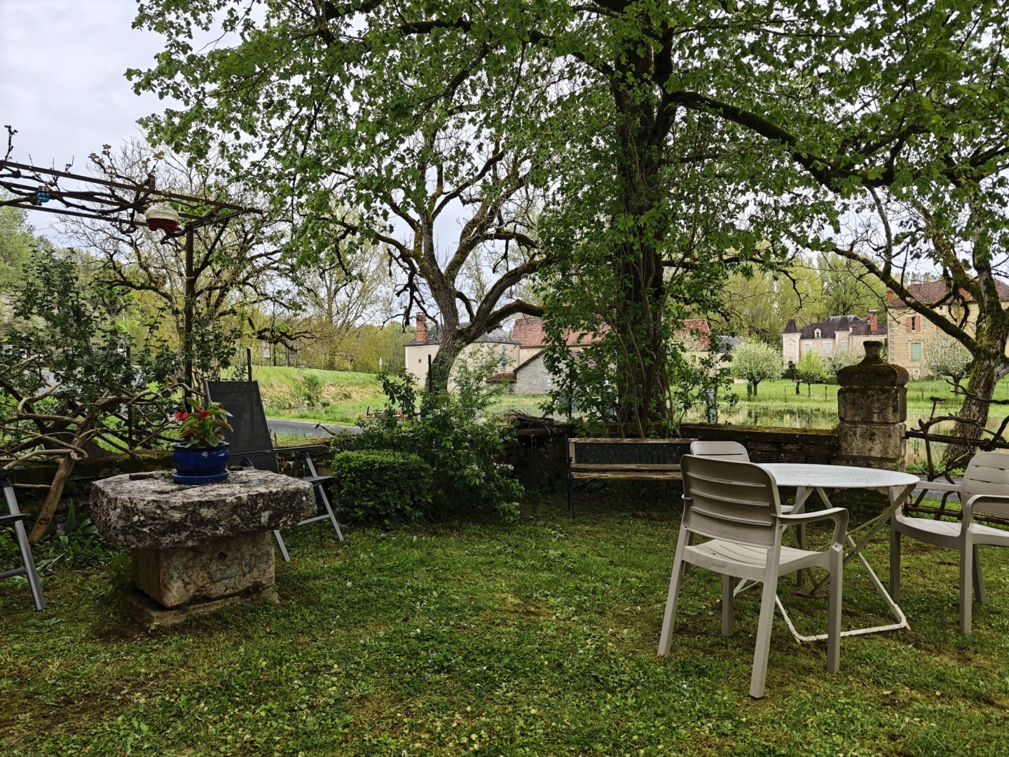 La maison est à l'écart du village (200 m), au bord de la rivière quelques fois en manque d'eau certains étés très chaud.