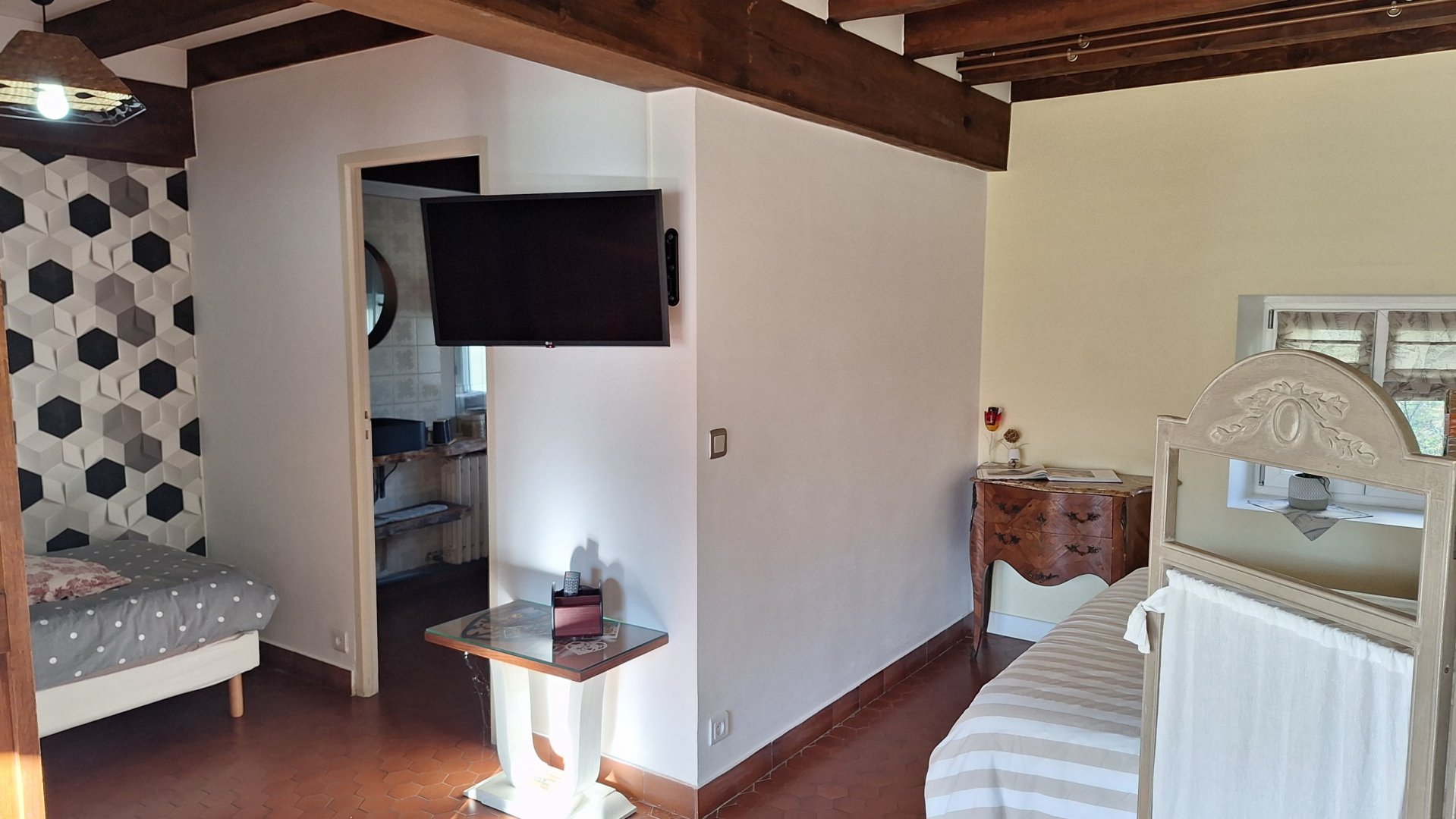 Vous disposerez d'un gîte de 38 m² en rez-de-chaussée d'une vielle grange rénovée que nous habitons. Vous serez néanmoins indépendants.
