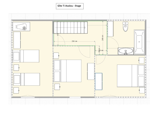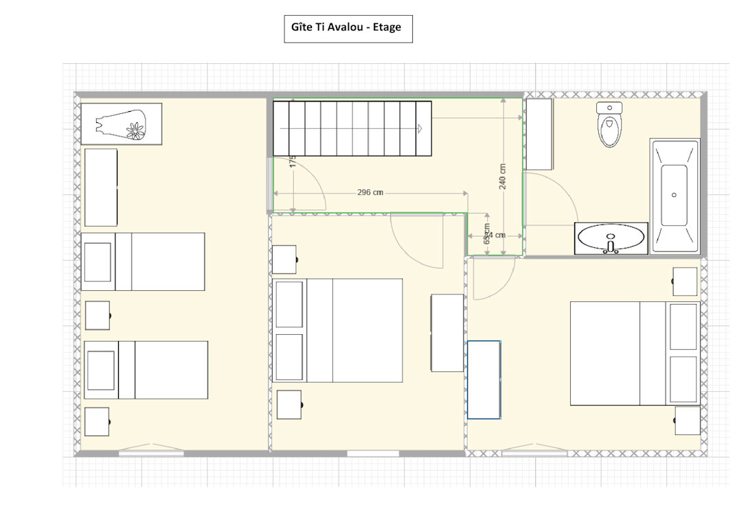 • floor: 3 bedrooms (1 bed 160x200, 1 bed 160x200, 2 single beds 90x190), bathroom with bath and wc