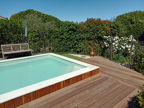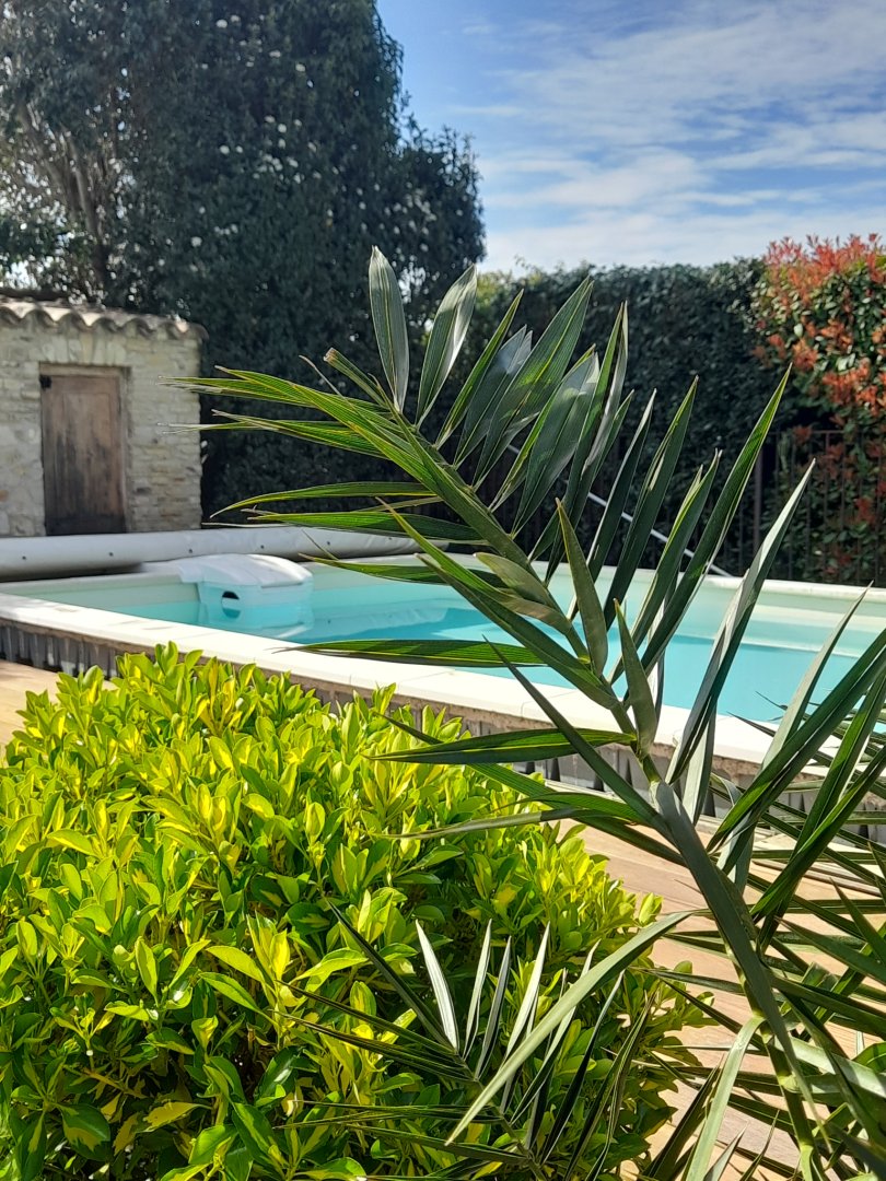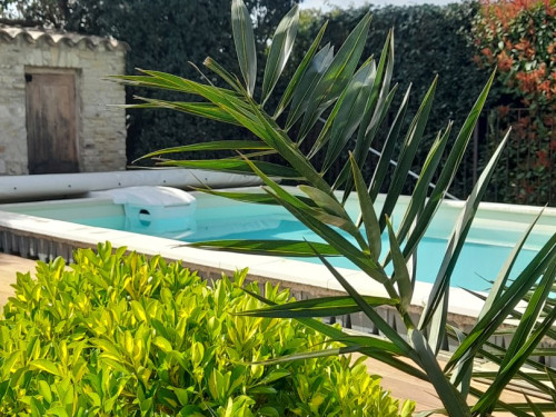 Une piscine en face du gîte avec barrière sécurisée, équipée de transats et parasols.