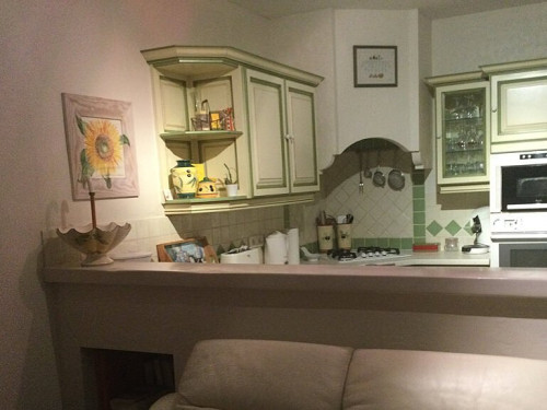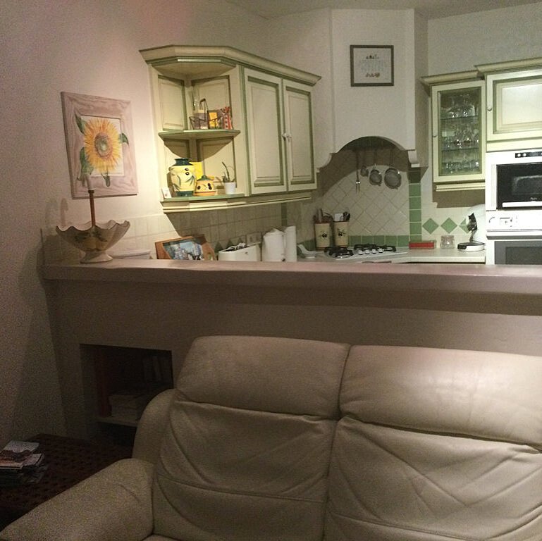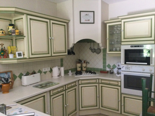 Pièce de vie avec banquette électrique et cuisine incorporée style provençale toute équipée.