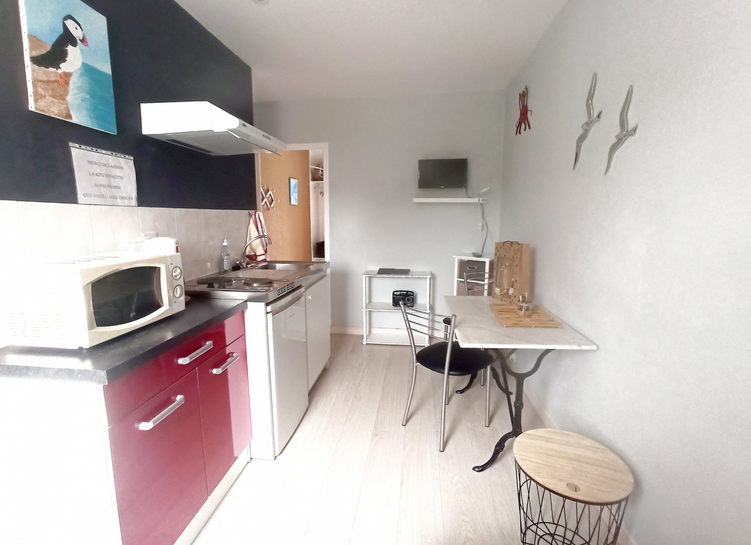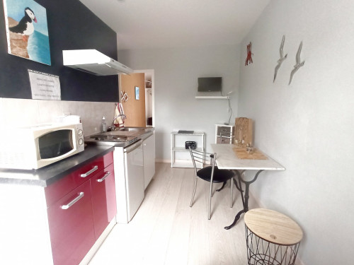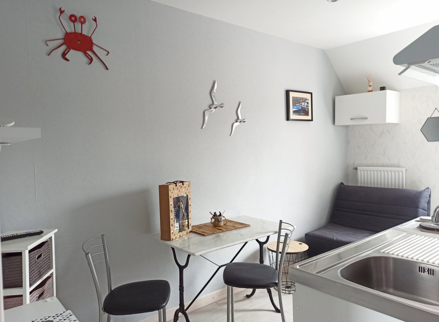 - une pièce de vie avec cuisinette, banquette BZ 1 personne, table et chaises, télévision, côté rue