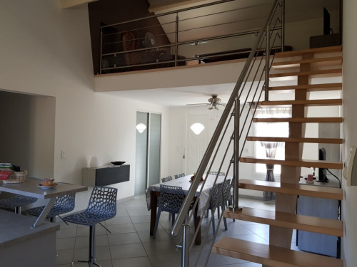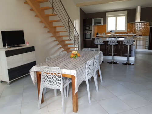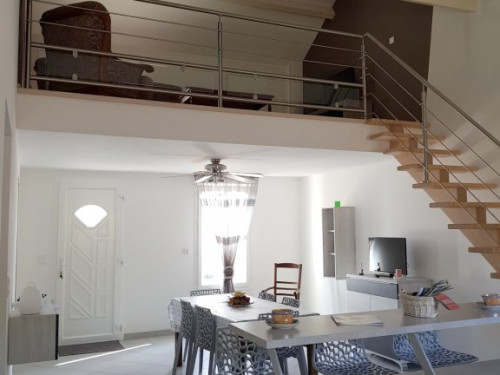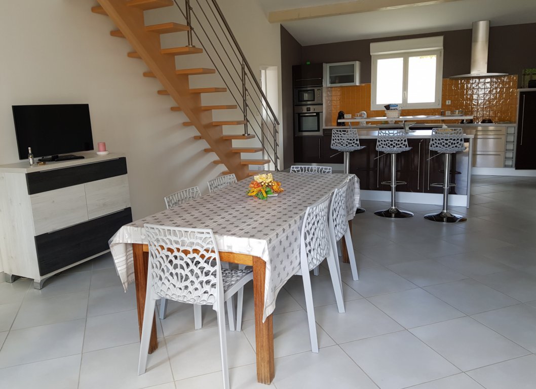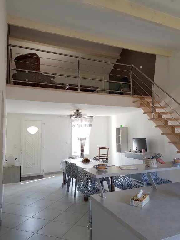 Grande pièce avec salle à manger, cuisine américaine, salon détente avec télé en mezzanine, grande salle d'eau, WC