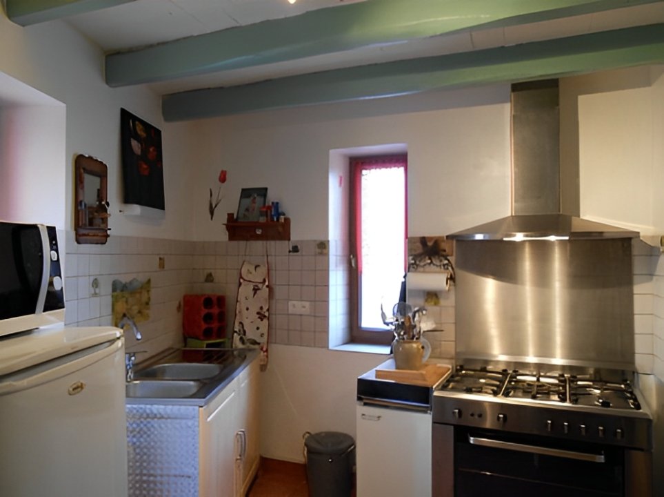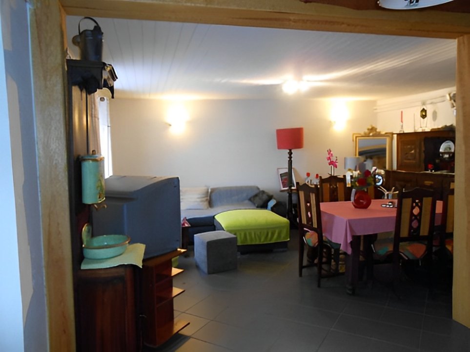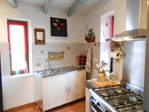 Ground floor: American kitchen, dining room-living room with TV and corner sofa, wood stove.