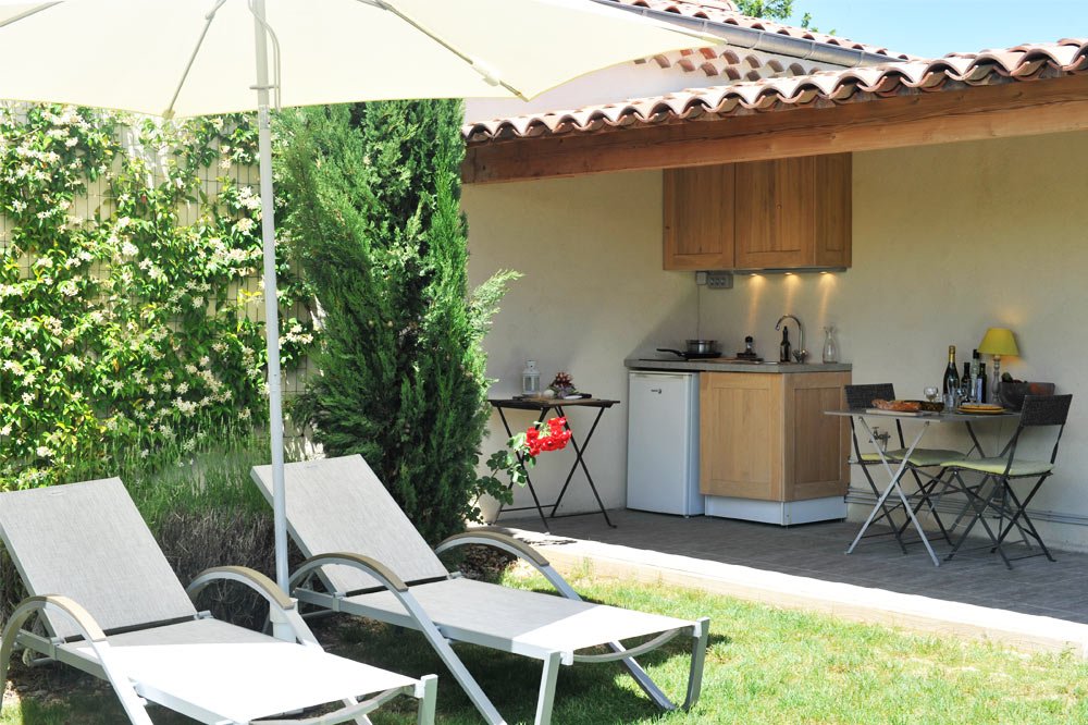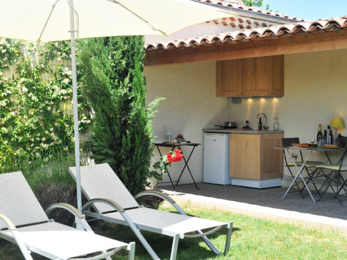 Independent entrance via an outside staircase, Bathroom with spa bath, large walk-in shower, washbasin, towel dryer, WC, Small fitted kitchen, Large 30 m² suite including a double bed, a Living & Dining room (ceiling crawling), flat screen TV & DVD player, private garden not overlooked (about ten meters away), barbecue, covered terrace, washing machine (shared use).