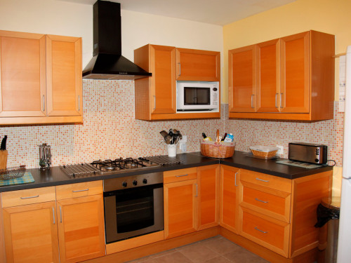 Une cuisine individuelle, entièrement équipée et moderne comprenant, four électrique, plaques de cuisson, micro-ondes, réfrigérateur-congélateur, lave-linge et lave-vaisselle.