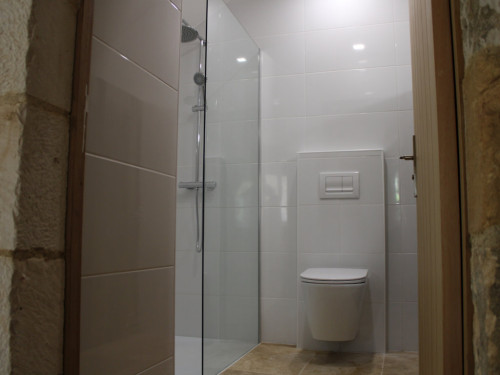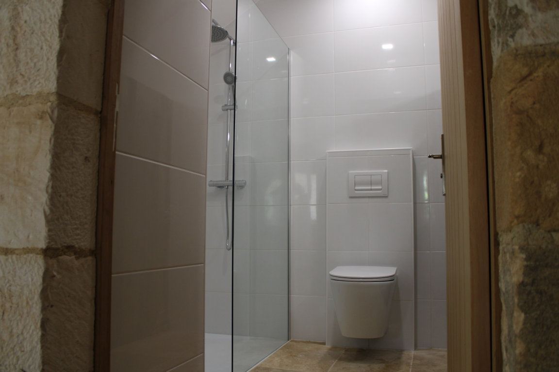 La salle de bains moderne est équipée d'une grande douche à l'italienne, d'un WC suspendu et d'un meuble sous vasque.