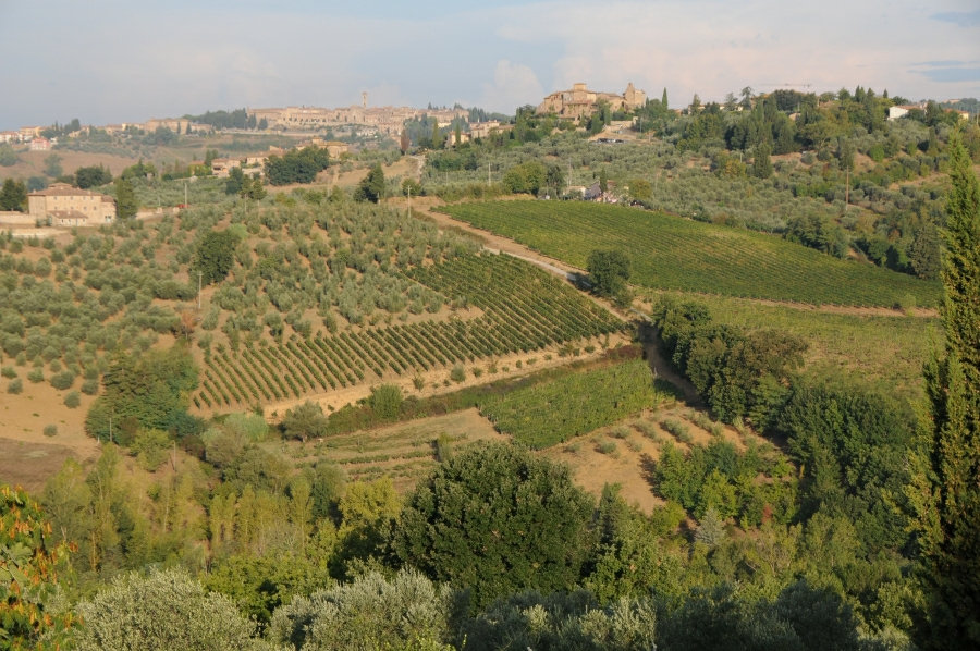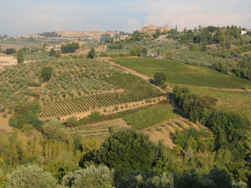 In the distance, standing out from the hills and cypresses, the towers of the famous medieval city of San Gimigniano...